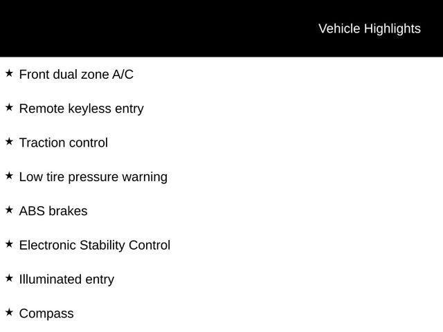 ABS brakes, Alloy wheels, Compass, Electronic Stability Control, Front dual zone A/C, Heated front seats, Illuminated entry, Low tire pressure warning, Remote keyless entry, Traction control.