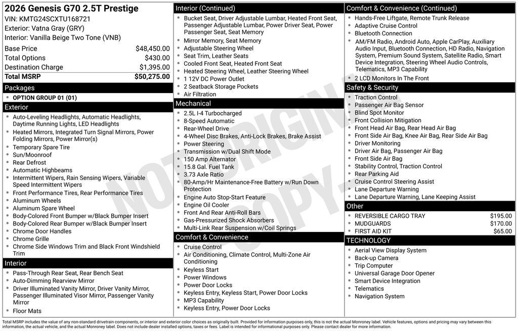 See dealer for details. Tax, tag, title, license, convenience charge ($23) and dealer documentation fee ($425) are extra (unless itemized above).