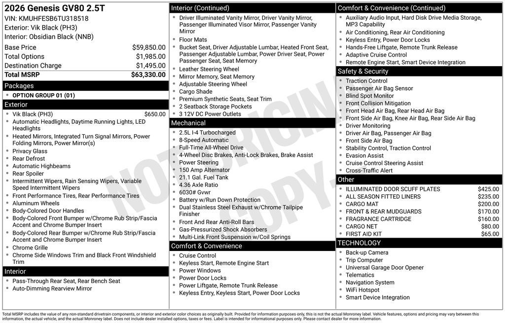 See dealer for details. Tax, tag, title, license, convenience charge ($23) and dealer documentation fee ($425) are extra (unless itemized above).