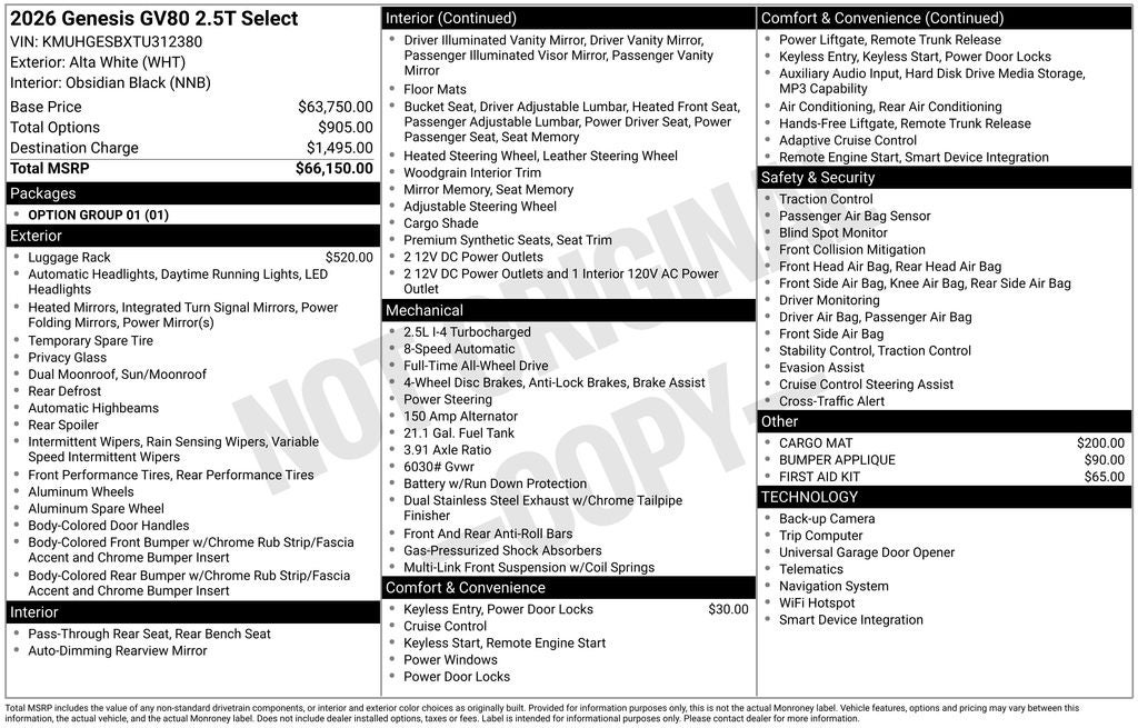 See dealer for details. Tax, tag, title, license, convenience charge ($23) and dealer documentation fee ($425) are extra (unless itemized above).