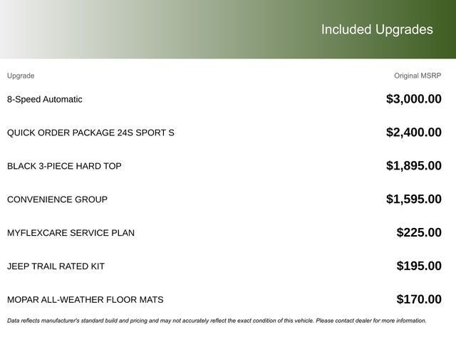 This vehicle comes with the following features and options:Convenience Group (2-Door Passive Entry, Front Door Locks, Air Conditioning with Auto Temp Control, Air Filtering, Cluster 7.0 TFT Color Display, Emergency/Assistance Call, Heated Front Seats, Heated Steering Wheel, and Universal Garage Door Opener), LED Headlamp and Fog Lamp Group (Front LED Fog Lamps and LED Premium Reflector Headlamps), Quick Order Package 24S Sport S (Advanced Brake Assist, Automatic Headlamps, Corning Gorilla Glass, Deep Tint Sunscreen Windows, Enhanced Adaptive Cruise Control, Full Speed Forward Collision Warning Plus, Power Heated Mirrors, Premium Wrapped Steering Wheel, Security Alarm, Sun Visors with Illuminated Vanity Mirrors, and Wheels: 17 x 7.5 Gray), 12.3 Touchscreen Display, 3.45 Overall Top Gear Ratio, 4-Wheel Disc Brakes, 4G LTE Wi-Fi Hot Spot, 8 Speakers, ABS brakes, Air Conditioning, AM/FM radio: SiriusXM with 360L, Apple CarPlay, Apple CarPlay/Android Auto, Aux Battery, Black 3-Piece Hard Top, Brake assist, Compass, Connectivity - US/Canada, Delay-off headlights, Driver door bin, Driver vanity mirror, Dual front impact airbags, Dual front side impact airbags, Electronic Stability Control, For More Info, Call 800-643-2112, Freedom Panel Storage Bag, Front anti-roll bar, Front Bucket Seats, Front Center Armrest w/Storage, Front fog lights, Front reading lights, Google Android Auto, Illuminated entry, Integrated Center Stack Radio, Integrated roll-over protection, Jeep Trail Rated Kit, Low tire pressure warning, MOPAR All-Weather Floor Mats, Myflexcare Service Plan, No Soft Top, Non-Lock Fuel Cap Without Discriminator, Normal Duty Suspension, Occupant sensing airbag, Outside temperature display, Overhead airbag, Panic alarm, ParkView Rear Back-Up Camera, Passenger door bin, Passenger vanity mirror, Power steering, Power windows, Radio data system, Radio: Uconnect 5 with 12.3 Display, Rear anti-roll bar, Rear reading lights, Rear Window Defroster, Rear Window Wiper/Washer, Remote keyless entry, SiriusXM Radio Service, SiriusXM with 360L, Speed control, Split folding rear seat, Steering wheel mounted audio controls, Stop-Start Dual Battery System, Tachometer, Telescoping steering wheel, Tilt steering wheel, Traction control, Trip computer, Variably intermittent wipers, and Wheels: 17 x 7.5 Black Steel Styled.
