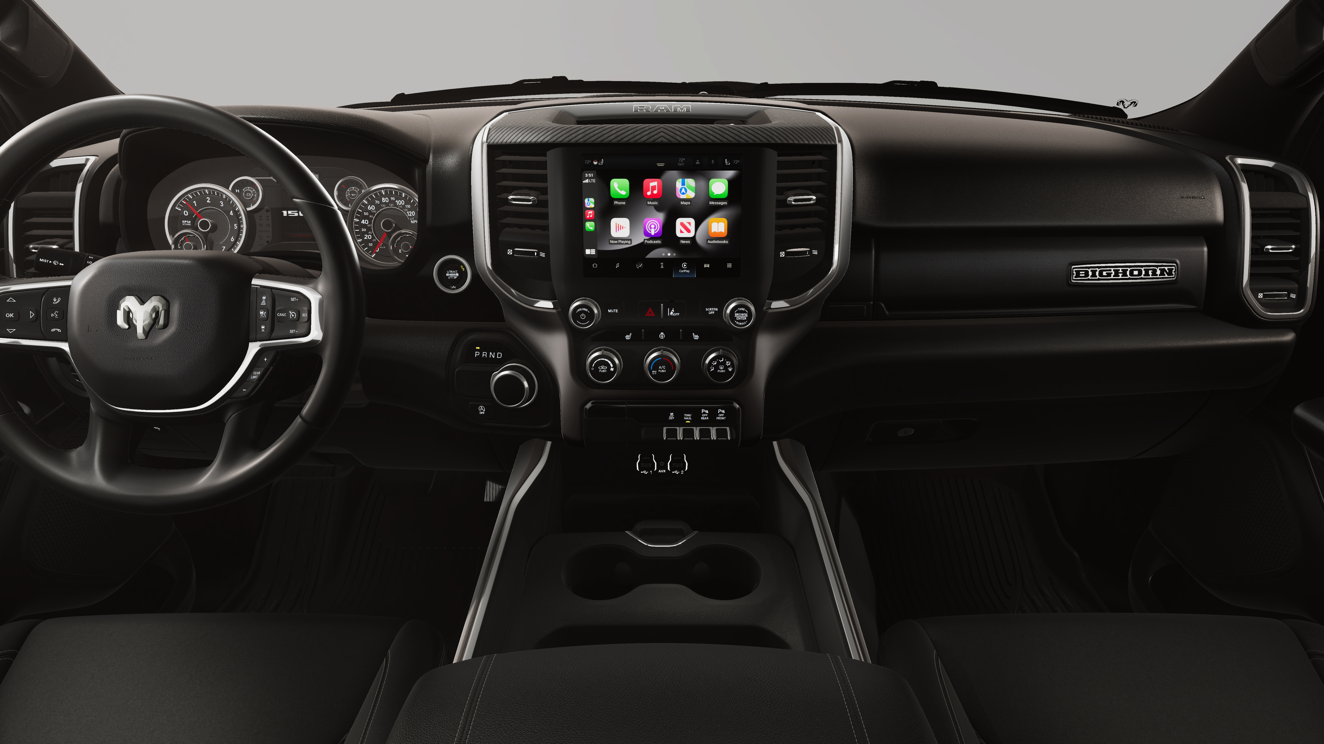 This vehicle comes with the following features and options:Big Horn Level 1 Equipment Group (115V Auxiliary Power Outlet, 2nd Row in Floor Storage Bins, 3 Rear Seat Head Restraints, 4 Way Front Headrests, 400W Inverter, Auto Power-Folding Mirrors, Auto-Dimming Exterior Driver Mirror, Auto-Dimming Rear-View Mirror, Black Exterior Mirrors, Black Premium Power Mirrors, Body Color Fender Flares, Bucket Seats, Center Console Parts Module, Convex Wide-Angle Exterior Mirror Insert, Deluxe Cloth Bucket Seats, Exterior Mirrors Courtesy Lamps, Exterior Mirrors with Heating Element, Exterior Mirrors with Supplemental Signals, Front Seat Back Map Pockets, Full Length Floor Console, Glove Box Lamp, Heated Front Seats, Heated Steering Wheel, Leather Wrapped Steering Wheel, Manual Adjust 4-Way Front Passenger Seat, Power 2-Way Driver Lumbar Adjust, Power Adjust 8-Way Driver Seat, Power Adjustable Pedals, Rear 60/40 Folding Seat, Rear Center Armrest, Rear Dome with on/Off Switch Lamp, Rear Power Sliding Window, Rear Window Defroster, SiriusXM Radio Service, SiriusXM Satellite Radio, Steering Wheel Mounted Audio Controls, Sun Visors with Illuminated Vanity Mirrors, and Universal Garage Door Opener), Quick Order Package 21Z Big Horn, 3.21 Rear Axle Ratio, 4-Wheel Disc Brakes, 48V Belt Starter Generator, 4G LTE Wi-Fi Hot Spot, 6 Speakers, ABS brakes, Air Conditioning, Alloy wheels, AM/FM radio, Anti-Spin Differential Rear Axle, Apple CarPlay, Apple CarPlay/Android Auto, Auto High-beam Headlights, Brake assist, Bumpers: chrome, Cloth Bucket Seats, Compass, Connectivity - US/Canada, Delay-off headlights, Driver door bin, Dual front impact airbags, Dual front side impact airbags, Electronic Stability Control, Exterior Parking Camera Rear, Front anti-roll bar, Front Bucket Seats, Front Center Armrest w/Storage, Front fog lights, Front reading lights, Front wheel independent suspension, Fully automatic headlights, Global Telematics Box Module, Google Android Auto, GPS Antenna Input, Heated door mirrors, Illuminated entry, Integrated Center Stack Radio, Integrated Voice Command with Bluetooth®, Low tire pressure warning, Manual Adjust 4-Way Driver Seat, Manual Folding Exterior Mirrors, MOPAR Front and Rear Rubber Floor Mats, MyFlexCare Service Plan, Occupant sensing airbag, Outside temperature display, Overhead airbag, Overhead console, Panic alarm, Passenger door bin, Passenger vanity mirror, Power door mirrors, Power steering, Power windows, Radio data system, Radio: Uconnect 5 W with 8.4 Display, RAM Grille Badge - Chrome, Rear anti-roll bar, Rear step bumper, Remote keyless entry, Speed control, Supplier Part Tracking (J-1), Tachometer, Telescoping steering wheel, Tilt steering wheel, Traction control, Trip computer, USB Host Flip, Variably intermittent wipers, Voltmeter, and Wheels: 18 x 8 Cast-Aluminum Painted.