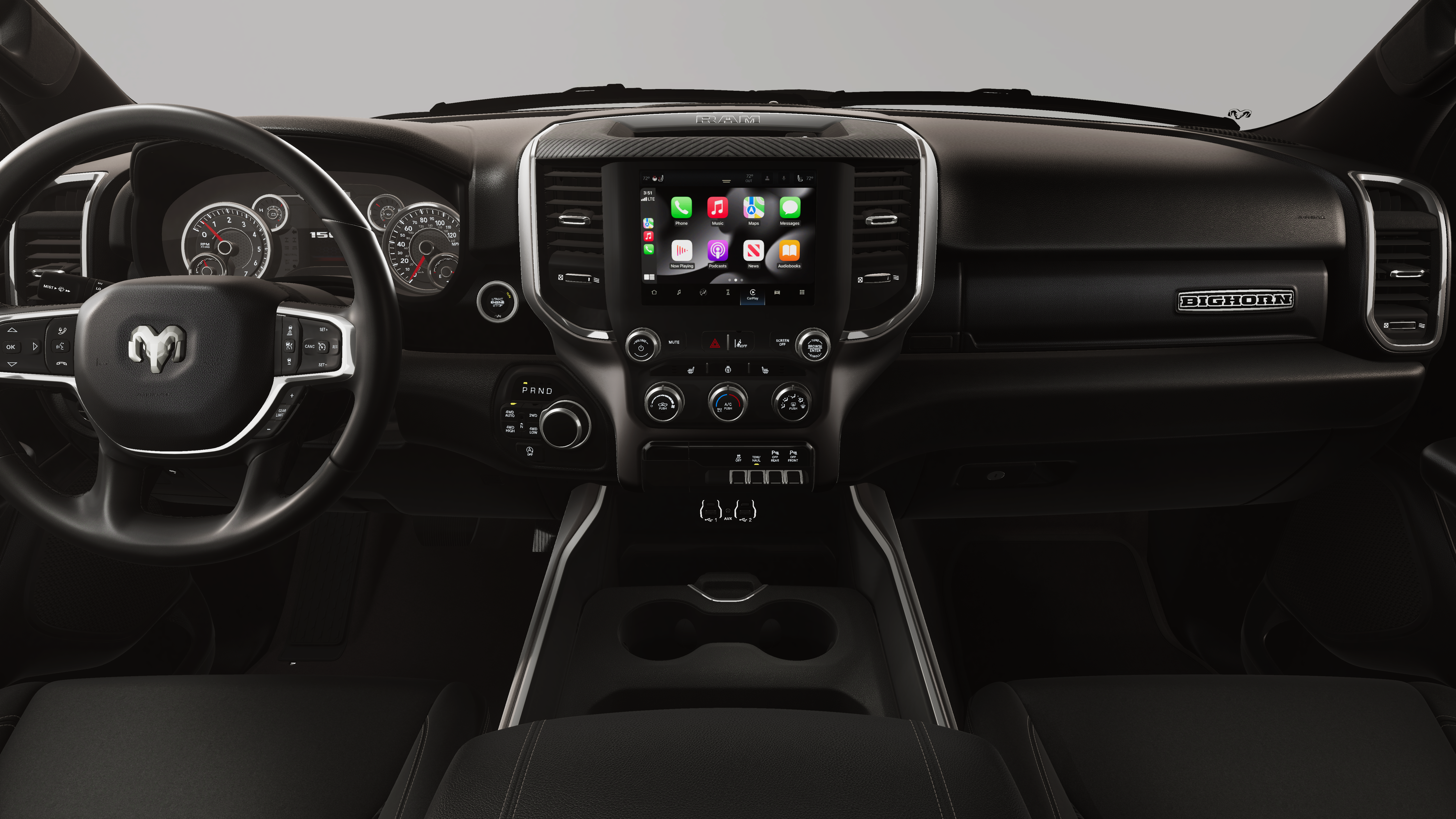 This vehicle comes with the following features and options:Big Horn Level 1 Equipment Group (115V Auxiliary Power Outlet, 2nd Row in Floor Storage Bins, 3 Rear Seat Head Restraints, 4 Way Front Headrests, 400W Inverter, Auto Power-Folding Mirrors, Auto-Dimming Exterior Driver Mirror, Auto-Dimming Rear-View Mirror, Black Exterior Mirrors, Black Premium Power Mirrors, Body Color Fender Flares, Bucket Seats, Center Console Parts Module, Convex Wide-Angle Exterior Mirror Insert, Deluxe Cloth Bucket Seats, Exterior Mirrors Courtesy Lamps, Exterior Mirrors with Heating Element, Exterior Mirrors with Supplemental Signals, Front Seat Back Map Pockets, Full Length Floor Console, Glove Box Lamp, Heated Front Seats, Heated Steering Wheel, Leather Wrapped Steering Wheel, Manual Adjust 4-Way Front Passenger Seat, Power 2-Way Driver Lumbar Adjust, Power Adjust 8-Way Driver Seat, Power Adjustable Pedals, Rear 60/40 Folding Seat, Rear Center Armrest, Rear Dome with on/Off Switch Lamp, Rear Power Sliding Window, Rear Window Defroster, SiriusXM Radio Service, SiriusXM Satellite Radio, Steering Wheel Mounted Audio Controls, Sun Visors with Illuminated Vanity Mirrors, and Universal Garage Door Opener), Night Edition (Accent Color Door Handles, Accent Color Premium Power Mirrors, Accent Color Tailgate Handle, Anti-Spin Differential Rear Axle, Black Exterior Truck Badging, Black Headlamp Bezels, Black Interior Accents, Black Painted Exterior Mirrors Caps, Black Tail Lamp Bezels, Body Color Front Bumper, Body Color Rear Bumper with Step Pads, Dual Exhaust with Black Tips, Grille Black Surround Black Mesh, RAM Grille Badge - Black, and Wheels: 20 x 9.0 Aluminum Painted Clad), Quick Order Package 27Z Big Horn, 4-Wheel Disc Brakes, 48V Belt Starter Generator, 4G LTE Wi-Fi Hot Spot, 6 Speakers, ABS brakes, Air Conditioning, Alloy wheels, AM/FM radio, Apple CarPlay, Apple CarPlay/Android Auto, Auto High-beam Headlights, Brake assist, Bumpers: chrome, Cloth Bucket Seats, Compass, Connectivity - US/Canada, Delay-off headlights, Driver door bin, Dual front impact airbags, Dual front side impact airbags, Electronic Stability Control, Front anti-roll bar, Front Bucket Seats, Front Center Armrest w/Storage, Front fog lights, Front reading lights, Front wheel independent suspension, Fully automatic headlights, Global Telematics Box Module, Google Android Auto, GPS Antenna Input, Heated door mirrors, Illuminated entry, Integrated Center Stack Radio, Integrated Voice Command with Bluetooth®, Low tire pressure warning, Manual Adjust 4-Way Driver Seat, Manual Folding Exterior Mirrors, MyFlexCare Service Plan, Occupant sensing airbag, Outside temperature display, Overhead airbag, Overhead console, Panic alarm, ParkView Rear Back-Up Camera, Passenger door bin, Passenger vanity mirror, Power door mirrors, Power steering, Power windows, Radio data system, Radio: Uconnect 5 W with 8.4 Display, RAM Grille Badge - Chrome, Rear anti-roll bar, Rear step bumper, Remote keyless entry, Speed control, Supplier Part Tracking (J-1), Tachometer, Telescoping steering wheel, Tilt steering wheel, Traction control, Trip computer, USB Host Flip, Variably intermittent wipers, and Voltmeter.