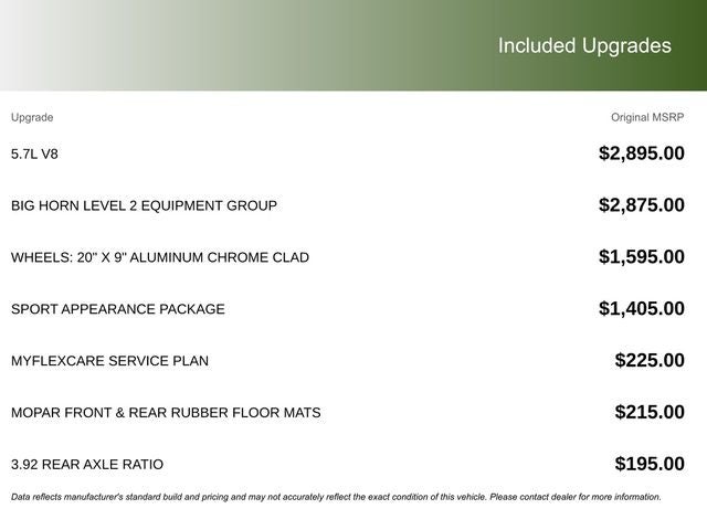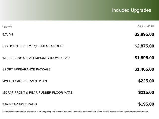 This vehicle comes with the following features and options:Big Horn Level 2 Equipment Group (115V Auxiliary Power Outlet, 115V Auxiliary Rear Power Outlet, 12 Touchscreen Display, 2nd Row in Floor Storage Bins, 3 Rear Seat Head Restraints, 4 Way Front Headrests, 400W Inverter, 4G LTE Wi-Fi Hot Spot, 9 Amplified Speakers with Subwoofer, Air Conditioning ATC with Dual Zone Control, Apple CarPlay, Auto Power-Folding Mirrors, Auto-Dimming Exterior Driver Mirror, Auto-Dimming Rear-View Mirror, Black Exterior Mirrors, Black Premium Power Mirrors, Body Color Fender Flares, Bucket Seats, Center Console Parts Module, Cluster 7.0 TFT Color Display, Configurable Drive Mode, Connected Travel and Traffic Services, Connectivity - US/Canada, Convex Wide-Angle Exterior Mirror Insert, Deluxe Cloth Bucket Seats, Disassociated Touchscreen Display, Exterior Mirrors Courtesy Lamps, Exterior Mirrors with Heating Element, Exterior Mirrors with Supplemental Signals, Front Seat Back Map Pockets, Full Length Floor Console, Global Telematics Box Module, Glove Box Lamp, Google Android Auto, GPS Antenna Input, GPS Navigation, HD Radio, Heated Front Seats, Heated Steering Wheel, Integrated Center Stack Radio, Integrated Voice Command with Bluetooth®, Leather Wrapped Steering Wheel, LED Dome Lamp with on/Off Switch, LED Footwell Lighting, Manual Adjust 4-Way Front Passenger Seat, Media Hub with 2 Charge Only USBs, Overhead LED Lamps, Power 2-Way Driver Lumbar Adjust, Power Adjust 8-Way Driver Seat, Power Adjustable Pedals, Premium Overhead Console, Radio: Uconnect 5 Navigation with 12.0 Display, Rear 60/40 Folding Seat, Rear Center Armrest, Rear Power Sliding Window, Rear Window Defroster, Remote Tailgate Release, Security Alarm, SiriusXM Radio Service, SiriusXM with 360L, Steering Wheel Mounted Audio Controls, Sun Visors with Illuminated Vanity Mirrors, Universal Garage Door Opener, and USB Host Flip), Quick Order Package 27Z Big Horn, Sport Appearance Package (Black Interior Accents, Body Color Door Handles, Body Color Front Bumper, Body Color Rear Bumper with Step Pads, Body Color Tailgate Handle, Grille Surround 1 Body Color Texture 1 Black, and RAM Grille Badge - Chrome), 4-Wheel Disc Brakes, 48V Belt Starter Generator, 6 Speakers, ABS brakes, Air Conditioning, Alloy wheels, AM/FM radio, Apple CarPlay/Android Auto, Auto High-beam Headlights, Brake assist, Bumpers: chrome, Cloth Bucket Seats, Compass, Delay-off headlights, Driver door bin, Dual front impact airbags, Dual front side impact airbags, Electronic Stability Control, Front anti-roll bar, Front Bucket Seats, Front Center Armrest w/Storage, Front fog lights, Front reading lights, Front wheel independent suspension, Fully automatic headlights, Heated door mirrors, Illuminated entry, Low tire pressure warning, Manual Adjust 4-Way Driver Seat, Manual Folding Exterior Mirrors, MOPAR Front and Rear Rubber Floor Mats, MyFlexCare Service Plan, Occupant sensing airbag, Outside temperature display, Overhead airbag, Overhead console, Panic alarm, ParkView Rear Back-Up Camera, Passenger door bin, Passenger vanity mirror, Power door mirrors, Power steering, Power windows, Radio data system, Radio: Uconnect 5 W with 8.4 Display, Rear anti-roll bar, Rear step bumper, Remote keyless entry, Speed control, Supplier Part Tracking (J-1), Tachometer, Telescoping steering wheel, Tilt steering wheel, Traction control, Trip computer, Variably intermittent wipers, and Voltmeter.