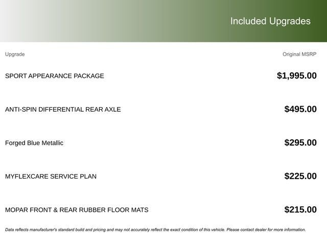 This vehicle comes with the following features and options:Quick Order Package 21H Laramie, Sport Appearance Package (Accent Color Premium Power Mirrors, Auto Power-Folding Mirrors, Auto-Dimming Exterior Driver Mirror, Black Interior Accents, Black Painted Exterior Mirrors Caps, Body Color Front Bumper, Body Color Rear Bumper with Step Pads, Bridgestone Brand Tires, Convex Wide-Angle Exterior Mirror Insert, Exterior Mirrors Courtesy Lamps, Exterior Mirrors with Heating Element, Exterior Mirrors with Memory, Exterior Mirrors with Supplemental Signals, Grille Surround 3 Body Color Tex 2 Black, RAM Grille Badge - Chrome, and Sport Performance Hood), 10 Speakers, 3.21 Rear Axle Ratio, 4-Wheel Disc Brakes, 4G LTE Wi-Fi Hot Spot, ABS brakes, Adjustable pedals, Air Conditioning, Alloy wheels, AM/FM radio: SiriusXM with 360L, Anti-Spin Differential Rear Axle, Apple CarPlay/Android Auto, Audio memory, Auto High-beam Headlights, Auto-dimming door mirrors, Auto-dimming Rear-View mirror, Automatic temperature control, Brake assist, Bumpers: chrome, Chrome Exterior Mirrors, Compass, Connected Travel and Traffic Services, Connectivity - US/Canada, Delay-off headlights, Driver door bin, Driver vanity mirror, Dual front impact airbags, Dual front side impact airbags, Electronic Stability Control, Exterior Parking Camera Rear, Front anti-roll bar, Front Bucket Seats, Front Center Armrest w/Storage, Front dual zone A/C, Front fog lights, Front reading lights, Front wheel independent suspension, Fully automatic headlights, Garage door transmitter, GPS Navigation, Heated door mirrors, Heated front seats, Heated rear seats, Heated steering wheel, Illuminated entry, Integrated Center Stack Radio, Integrated Voice Command with Bluetooth®, Leather steering wheel, Leather Trimmed Bucket Seats, Low tire pressure warning, Memory seat, MOPAR Front and Rear Rubber Floor Mats, MyFlexCare Service Plan, Navigation System, Occupant sensing airbag, Outside temperature display, Overhead airbag, Overhead console, Panic alarm, Passenger door bin, Passenger vanity mirror, Pedal memory, Power door mirrors, Power driver seat, Power passenger seat, Power steering, Power windows, Radio data system, Radio: Uconnect 5 Navigation with 12.0 Display, Rear anti-roll bar, Rear reading lights, Rear seat center armrest, Rear step bumper, Remote keyless entry, Security system, SiriusXM Radio Service, SiriusXM with 360L, Speed control, Split folding rear seat, Steering wheel mounted audio controls, Tachometer, Telescoping steering wheel, Tilt steering wheel, Traction control, Trip computer, Turn signal indicator mirrors, USB Host Flip, Variably intermittent wipers, Ventilated front seats, Voltmeter, and Wheels: 20 x 9 Premium Paint/Polish.