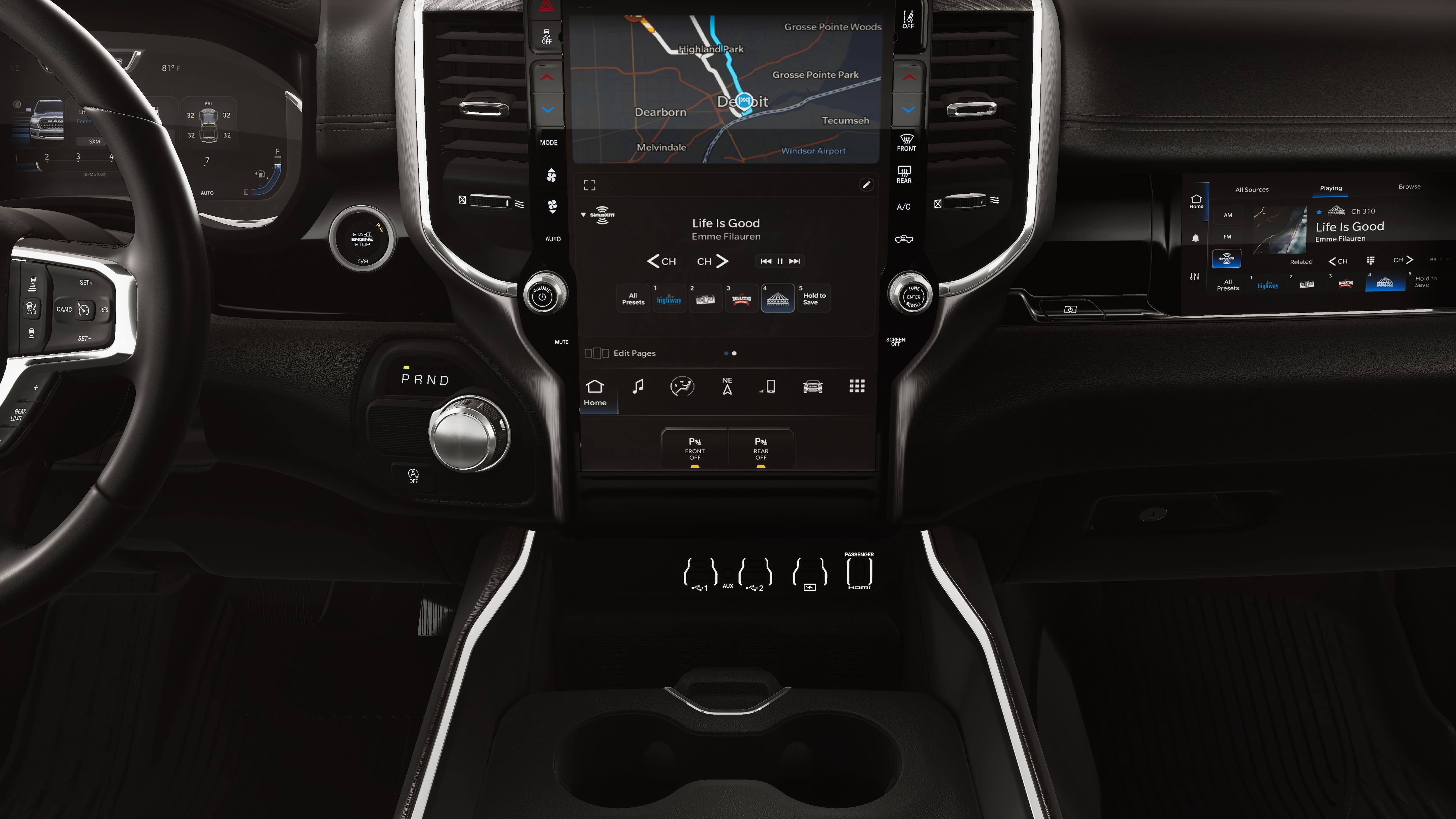 This vehicle comes with the following features and options:Bed Utility Group (Exterior 115V AC Outlet, MOPAR 4 Adjustable Cargo Tie-Down Hooks, and MOPAR Spray in Bedliner), Laramie Level 2 Equipment Group (14.4 Touchscreen Display, 4G LTE Wi-Fi Hot Spot, Cluster 12 TFT Color Display, Connected Travel and Traffic Services, Connectivity - US/Canada, Front Passenger Interactive Display, GPS Navigation, Harman/Kardon 19 Speaker Premium Sound, Integrated Center Stack Radio, Integrated Voice Command with Bluetooth®, Power Tailgate, Radio: Uconnect 5 Nav with 14.4 Display, Rain Sensitive Windshield Wipers, SiriusXM Radio Service, SiriusXM with 360L, and USB Host Flip), Night Edition (Accent Color Door Handles, Accent Color Premium Power Mirrors, Accent Color Tailgate Handle, Anti-Spin Differential Rear Axle, Auto Power-Folding Mirrors, Auto-Dimming Exterior Driver Mirror, Black Exterior Truck Badging, Black Headlamp Bezels, Black Interior Accents, Black Painted Exterior Mirrors Caps, Black Tail Lamp Bezels, Body Color Front Bumper, Body Color Rear Bumper with Step Pads, Convex Wide-Angle Exterior Mirror Insert, Dual Exhaust with Black Tips, Exterior Mirrors Approach Lamps, Exterior Mirrors Courtesy Lamps, Exterior Mirrors with Heating Element, Exterior Mirrors with Memory, Exterior Mirrors with Supplemental Signals, Grille Surround 3 Black Texture 2 Black, Pirelli Brand Tires, Proximity Approach/Departure Lamps, RAM Grille Badge - Black, Sport Performance Hood, and Wheels: 22 x 9 Forged Aluminum), Quick Order Package 21H Laramie, 10 Speakers, 3.21 Rear Axle Ratio, 4-Wheel Disc Brakes, ABS brakes, Adjustable pedals, Air Conditioning, Alloy wheels, AM/FM radio: SiriusXM with 360L, Apple CarPlay/Android Auto, Audio memory, Auto High-beam Headlights, Auto-dimming door mirrors, Auto-dimming Rear-View mirror, Automatic temperature control, Brake assist, Bumpers: chrome, Chrome Exterior Mirrors, Compass, Delay-off headlights, Driver door bin, Driver vanity mirror, Dual front impact airbags, Dual front side impact airbags, Electronic Stability Control, Exterior Parking Camera Rear, Front anti-roll bar, Front Bucket Seats, Front Center Armrest w/Storage, Front dual zone A/C, Front fog lights, Front reading lights, Front wheel independent suspension, Fully automatic headlights, Garage door transmitter, Heated door mirrors, Heated front seats, Heated rear seats, Heated steering wheel, Illuminated entry, Leather steering wheel, Leather Trimmed Bucket Seats, Low tire pressure warning, Memory seat, MOPAR Front and Rear Rubber Floor Mats, MyFlexCare Service Plan, Navigation System, Occupant sensing airbag, Outside temperature display, Overhead airbag, Overhead console, Panic alarm, Passenger door bin, Passenger vanity mirror, Pedal memory, Power door mirrors, Power driver seat, Power passenger seat, Power steering, Power windows, Radio data system, Radio: Uconnect 5 Navigation with 12.0 Display, RAM Grille Badge - Chrome, Rear anti-roll bar, Rear reading lights, Rear seat center armrest, Rear step bumper, Remote keyless entry, Security system, Speed control, Split folding rear seat, Steering wheel mounted audio controls, Tachometer, Telescoping steering wheel, Tilt steering wheel, Traction control, Trip computer, Turn signal indicator mirrors, Variably intermittent wipers, Ventilated front seats, Voltmeter, and Wheels: 20 x 9 Premium Paint/Polish.