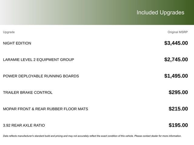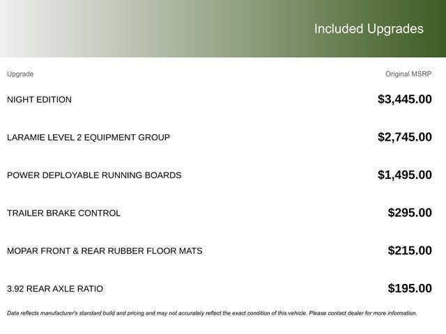 This vehicle comes with the following features and options:Laramie Level 2 Equipment Group (14.4 Touchscreen Display, 4G LTE Wi-Fi Hot Spot, Cluster 12 TFT Color Display, Connected Travel and Traffic Services, Connectivity - US/Canada, Front Passenger Interactive Display, GPS Navigation, Harman/Kardon 19 Speaker Premium Sound, Integrated Center Stack Radio, Integrated Voice Command with Bluetooth®, Power Tailgate, Radio: Uconnect 5 Nav with 14.4 Display, Rain Sensitive Windshield Wipers, SiriusXM Radio Service, SiriusXM with 360L, and USB Host Flip), Night Edition (Accent Color Door Handles, Accent Color Premium Power Mirrors, Accent Color Tailgate Handle, Anti-Spin Differential Rear Axle, Auto Power-Folding Mirrors, Auto-Dimming Exterior Driver Mirror, Black Exterior Truck Badging, Black Headlamp Bezels, Black Interior Accents, Black Painted Exterior Mirrors Caps, Black Tail Lamp Bezels, Body Color Front Bumper, Body Color Rear Bumper with Step Pads, Convex Wide-Angle Exterior Mirror Insert, Dual Exhaust with Black Tips, Exterior Mirrors Approach Lamps, Exterior Mirrors Courtesy Lamps, Exterior Mirrors with Heating Element, Exterior Mirrors with Memory, Exterior Mirrors with Supplemental Signals, Grille Surround 3 Black Texture 2 Black, Pirelli Brand Tires, Proximity Approach/Departure Lamps, RAM Grille Badge - Black, Sport Performance Hood, and Wheels: 22 x 9 Forged Aluminum), Quick Order Package 21H Laramie, 10 Speakers, 4-Wheel Disc Brakes, ABS brakes, Active Noise Control System, Air Conditioning, Alloy wheels, AM/FM radio: SiriusXM with 360L, Apple CarPlay/Android Auto, Audio memory, Auto High-beam Headlights, Auto-dimming door mirrors, Auto-dimming Rear-View mirror, Automatic temperature control, Brake assist, Bumpers: chrome, Chrome Exterior Mirrors, Compass, Delay-off headlights, Driver door bin, Driver vanity mirror, Dual front impact airbags, Dual front side impact airbags, Electronic Stability Control, Front anti-roll bar, Front Bucket Seats, Front Center Armrest w/Storage, Front dual zone A/C, Front fog lights, Front reading lights, Front wheel independent suspension, Fully automatic headlights, Garage door transmitter, Heated door mirrors, Heated front seats, Heated rear seats, Heated steering wheel, Illuminated entry, Leather steering wheel, Leather Trimmed Bucket Seats, Low tire pressure warning, Manufacturer's Statement of Origin, Memory seat, MOPAR Front and Rear Rubber Floor Mats, Navigation System, Occupant sensing airbag, Off-Road Information Pages, Outside temperature display, Overhead airbag, Overhead console, Panic alarm, ParkView Rear Back-Up Camera, Passenger door bin, Passenger vanity mirror, Power Deployable Running Boards, Power door mirrors, Power driver seat, Power passenger seat, Power steering, Power windows, Radio data system, Radio: Uconnect 5 Navigation with 12.0 Display, RAM Grille Badge - Chrome, Rear anti-roll bar, Rear reading lights, Rear seat center armrest, Rear step bumper, Remote keyless entry, Security system, Speed control, Split folding rear seat, Steering wheel mounted audio controls, Tachometer, Telescoping steering wheel, Tilt steering wheel, Traction control, Trailer Brake Control, Trip computer, Turn signal indicator mirrors, Variably intermittent wipers, Ventilated front seats, Voltmeter, and Wheels: 20 x 9 Premium Paint/Polish.