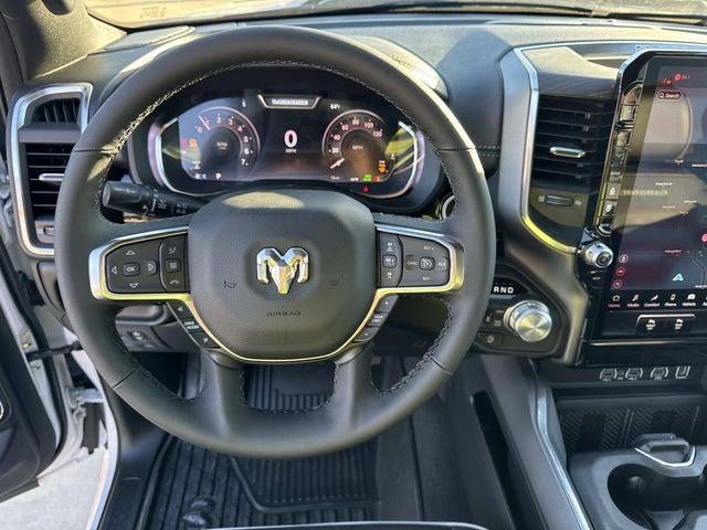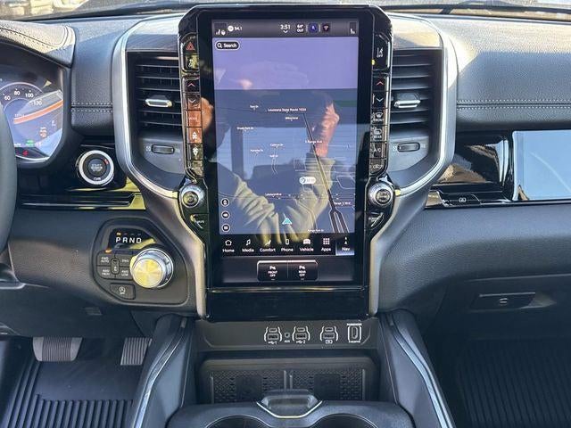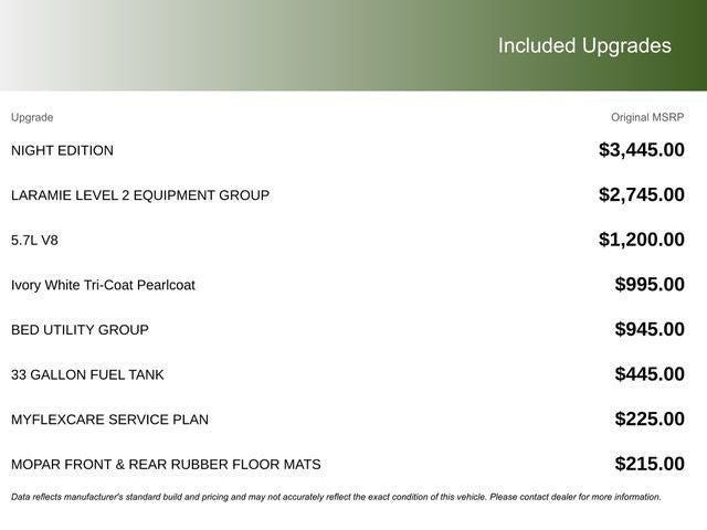This vehicle comes with the following features and options:Bed Utility Group (Exterior 115V AC Outlet, MOPAR 4 Adjustable Cargo Tie-Down Hooks, and MOPAR Spray in Bedliner), Laramie Level 2 Equipment Group (14.4 Touchscreen Display, 4G LTE Wi-Fi Hot Spot, Cluster 12 TFT Color Display, Connected Travel and Traffic Services, Connectivity - US/Canada, Front Passenger Interactive Display, GPS Navigation, Harman/Kardon 19 Speaker Premium Sound, Integrated Center Stack Radio, Integrated Voice Command with Bluetooth®, Power Tailgate, Radio: Uconnect 5 Nav with 14.4 Display, Rain Sensitive Windshield Wipers, SiriusXM Radio Service, SiriusXM with 360L, and USB Host Flip), Night Edition (Accent Color Door Handles, Accent Color Premium Power Mirrors, Accent Color Tailgate Handle, Anti-Spin Differential Rear Axle, Auto Power-Folding Mirrors, Auto-Dimming Exterior Driver Mirror, Black Exterior Truck Badging, Black Headlamp Bezels, Black Interior Accents, Black Painted Exterior Mirrors Caps, Black Tail Lamp Bezels, Body Color Front Bumper, Body Color Rear Bumper with Step Pads, Convex Wide-Angle Exterior Mirror Insert, Dual Exhaust with Black Tips, Exterior Mirrors Approach Lamps, Exterior Mirrors Courtesy Lamps, Exterior Mirrors with Heating Element, Exterior Mirrors with Memory, Exterior Mirrors with Supplemental Signals, Grille Surround 3 Black Texture 2 Black, Pirelli Brand Tires, Proximity Approach/Departure Lamps, RAM Grille Badge - Black, Sport Performance Hood, and Wheels: 22 x 9 Forged Aluminum), Quick Order Package 27H Laramie, 10 Speakers, 33 Gallon Fuel Tank, 4-Wheel Disc Brakes, ABS brakes, Active Noise Control System, Adjustable pedals, Air Conditioning, Alloy wheels, AM/FM radio: SiriusXM with 360L, Apple CarPlay/Android Auto, Audio memory, Auto High-beam Headlights, Auto-dimming door mirrors, Auto-dimming Rear-View mirror, Automatic temperature control, Brake assist, Bumpers: chrome, Chrome Exterior Mirrors, Compass, Delay-off headlights, Driver door bin, Driver vanity mirror, Dual front impact airbags, Dual front side impact airbags, Electronic Stability Control, Front anti-roll bar, Front Bucket Seats, Front Center Armrest w/Storage, Front dual zone A/C, Front fog lights, Front reading lights, Front wheel independent suspension, Fully automatic headlights, Garage door transmitter, Heated door mirrors, Heated front seats, Heated rear seats, Heated steering wheel, Illuminated entry, Leather steering wheel, Leather Trimmed Bucket Seats, Low tire pressure warning, Memory seat, MOPAR Front and Rear Rubber Floor Mats, MyFlexCare Service Plan, Navigation System, Occupant sensing airbag, Off-Road Information Pages, Outside temperature display, Overhead airbag, Overhead console, Panic alarm, ParkView Rear Back-Up Camera, Passenger door bin, Passenger vanity mirror, Pedal memory, Power door mirrors, Power driver seat, Power passenger seat, Power steering, Power windows, Radio data system, Radio: Uconnect 5 Navigation with 12.0 Display, RAM Grille Badge - Chrome, Rear anti-roll bar, Rear reading lights, Rear seat center armrest, Rear step bumper, Remote keyless entry, Security system, Speed control, Split folding rear seat, Steering wheel mounted audio controls, Tachometer, Telescoping steering wheel, Tilt steering wheel, Traction control, Trip computer, Turn signal indicator mirrors, Variably intermittent wipers, Ventilated front seats, Voltmeter, and Wheels: 20 x 9 Premium Paint/Polish.