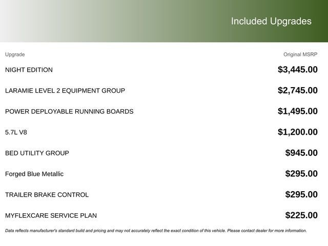 This vehicle comes with the following features and options:Bed Utility Group (Exterior 115V AC Outlet, MOPAR 4 Adjustable Cargo Tie-Down Hooks, and MOPAR Spray in Bedliner), Laramie Level 2 Equipment Group (14.4 Touchscreen Display, 4G LTE Wi-Fi Hot Spot, Cluster 12 TFT Color Display, Connected Travel and Traffic Services, Connectivity - US/Canada, Front Passenger Interactive Display, GPS Navigation, Harman/Kardon 19 Speaker Premium Sound, Integrated Center Stack Radio, Integrated Voice Command with Bluetooth®, Power Tailgate, Radio: Uconnect 5 Nav with 14.4 Display, Rain Sensitive Windshield Wipers, SiriusXM Radio Service, SiriusXM with 360L, and USB Host Flip), Night Edition (Accent Color Door Handles, Accent Color Premium Power Mirrors, Accent Color Tailgate Handle, Anti-Spin Differential Rear Axle, Auto Power-Folding Mirrors, Auto-Dimming Exterior Driver Mirror, Black Exterior Truck Badging, Black Headlamp Bezels, Black Interior Accents, Black Painted Exterior Mirrors Caps, Black Tail Lamp Bezels, Body Color Front Bumper, Body Color Rear Bumper with Step Pads, Convex Wide-Angle Exterior Mirror Insert, Dual Exhaust with Black Tips, Exterior Mirrors Approach Lamps, Exterior Mirrors Courtesy Lamps, Exterior Mirrors with Heating Element, Exterior Mirrors with Memory, Exterior Mirrors with Supplemental Signals, Grille Surround 3 Black Texture 2 Black, Pirelli Brand Tires, Proximity Approach/Departure Lamps, RAM Grille Badge - Black, Sport Performance Hood, and Wheels: 22 x 9 Forged Aluminum), Quick Order Package 27H Laramie, 10 Speakers, 4-Wheel Disc Brakes, ABS brakes, Active Noise Control System, Adjustable pedals, Air Conditioning, Alloy wheels, AM/FM radio: SiriusXM with 360L, Apple CarPlay/Android Auto, Audio memory, Auto High-beam Headlights, Auto-dimming door mirrors, Auto-dimming Rear-View mirror, Automatic temperature control, Brake assist, Bumpers: chrome, Chrome Exterior Mirrors, Compass, Delay-off headlights, Driver door bin, Driver vanity mirror, Dual front impact airbags, Dual front side impact airbags, Electronic Stability Control, Front anti-roll bar, Front Bucket Seats, Front Center Armrest w/Storage, Front dual zone A/C, Front fog lights, Front reading lights, Front wheel independent suspension, Fully automatic headlights, Garage door transmitter, Heated door mirrors, Heated front seats, Heated rear seats, Heated steering wheel, Illuminated entry, Leather steering wheel, Leather Trimmed Bucket Seats, Low tire pressure warning, Memory seat, MOPAR Front and Rear Rubber Floor Mats, MyFlexCare Service Plan, Navigation System, Occupant sensing airbag, Off-Road Information Pages, Outside temperature display, Overhead airbag, Overhead console, Panic alarm, ParkView Rear Back-Up Camera, Passenger door bin, Passenger vanity mirror, Pedal memory, Power Deployable Running Boards, Power door mirrors, Power driver seat, Power passenger seat, Power steering, Power windows, Radio data system, Radio: Uconnect 5 Navigation with 12.0 Display, RAM Grille Badge - Chrome, Rear anti-roll bar, Rear reading lights, Rear seat center armrest, Rear step bumper, Remote keyless entry, Security system, Speed control, Split folding rear seat, Steering wheel mounted audio controls, Tachometer, Telescoping steering wheel, Tilt steering wheel, Traction control, Trailer Brake Control, Trip computer, Turn signal indicator mirrors, Variably intermittent wipers, Ventilated front seats, Voltmeter, and Wheels: 20 x 9 Premium Paint/Polish.