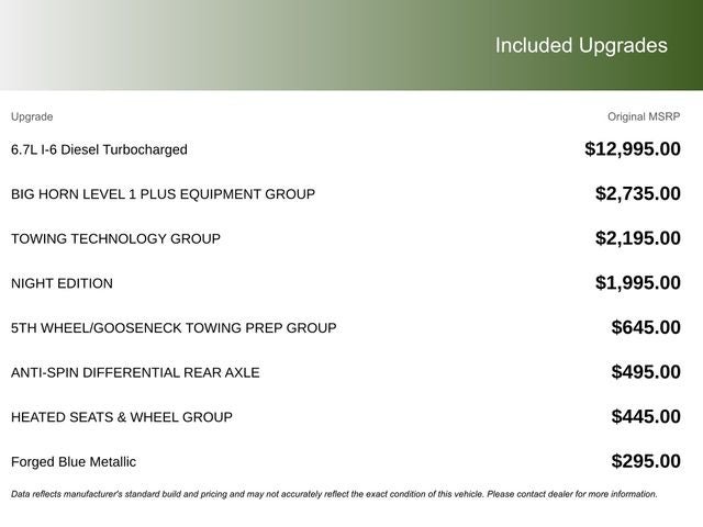 This vehicle comes with the following features and options:Big Horn Level 1 Plus Equipment Group (12 Touchscreen Display, 2 Way Rear Headrest Seat, 2nd Row in Floor Storage Bins, 4 Way Front Headrests, 40/20/40 Split Bench Seat, 4G LTE Wi-Fi Hot Spot, 9 Alpine Speakers with Subwoofer, Air Conditioning ATC with Dual Zone Control, Alexa Built-in, Anti-Spin Differential Rear Axle, Apple CarPlay, Auto Power-Folding Mirrors, Auto-Dimming Rear-View Mirror, Black Exterior Mirrors, Connected Travel and Traffic Services, Connectivity - US/Canada, Disassociated Touchscreen Display, Dual Glove Boxes, Emergency Vehicle Alert System (EVAS), Exterior Mirrors Courtesy Lamps, Exterior Mirrors with Heating Element, Exterior Mirrors with Supplemental Signals, Foam Bottle Insert (door Trim Panel), Folding Flat Load Floor Storage, Footwell Courtesy Lamp, For Details, Visit DriveUconnect.com, For More Info, Call 800-643-2112, Forward and Reverse Utility Lights, Front Armrest with Cupholders, Front Center Seat Cushion Storage, Front Seat Back Map Pockets, Global Telematics Box Module, Glove Box Lamp, Google Android Auto, GPS Antenna Input, GPS Navigation, HD Radio, Integrated Voice Command with Bluetooth®, LED Bed Lighting, Locking Lower Glove Box, Luxury Steering Wheel, Manual Adjust 4-Way Front Passenger Seat, Mirror Running Lights, MOPAR Deployable Bed Step, MOPAR Spray in Bedliner, Off-Road Info Pages, Power 2-Way Driver Lumbar Adjust, Power Adjust 8-Way Driver Seat, Power Adjust Mirrors, Power Heated Folding Telescopic Mirrors, Power Telescoping Mirrors, Power-Adjustable Convex Aux Mirrors, Premium Cloth 40/20/40 Bench Seat, Radio: Uconnect 5 Navigation with 12.0 Display, Rear 60/40 Folding Seat, Rear Dome with on/Off Switch Lamp, Remote Start System, Remote USB Port - Charge Only, Selectable Tire Fill Alert, SiriusXM Radio Service, SiriusXM with 360L, Steering Wheel Mounted Audio Controls, Storage Tray, and Trailer Tow Pages), Heated Seats and Wheel Group (Heated Front Seats and Heated Steering Wheel), Night Edition (Black Exterior Truck Badging, Black Interior Accents, Black Wheel Center Hub, Body Color Grille-Surround, Gloss Black Nostrils/Mic Black Grille, Painted Front Bumper, Painted Rear Bumper, and Wheels: 20 x 8.0 Black Painted Aluminum), Quick Order Package 24Z Big Horn, Towing Technology Group (Blind Spot and Cross Path Detection, Center Stop Lamp with Cargo View Camera, LED Tail Lamps, Red Tail Lamp Bezels, Surround View Camera System, Trailer Reverse Guidance, and Trailer Tire Pressure Monitoring System), 4-Wheel Disc Brakes, 5th Wheel/Gooseneck Towing Prep Group, 6 Speakers, ABS brakes, Air Conditioning, Alloy wheels, AM/FM radio: SiriusXM, Apple CarPlay/Android Auto, Brake assist, Bumpers: chrome, Center Hub, Clearance Lamps, Cloth 40/20/40 Bench Seat, Compass, Dash Pass Thru Wire Circuits, Delay-off headlights, Driver door bin, Dual front impact airbags, Dual front side impact airbags, Electronic Stability Control, Front anti-roll bar, Front Center Armrest w/Storage, Front fog lights, Front License Plate Bracket, Front reading lights, Fully automatic headlights, Heated door mirrors, Illuminated entry, Instrument Panel Mounted Auxiliary Switches, Low tire pressure warning, Manual Adjust 4-Way Driver Seat, MOPAR Front and Rear Rubber Floor Mats, Occupant sensing airbag, Outside temperature display, Overhead airbag, Overhead console, Panic alarm, ParkView Rear Back-Up Camera, Passenger door bin, Passenger vanity mirror, Power door mirrors, Power steering, Power windows, Radio data system, Radio: Uconnect 5 with 8.4 Display, Rear anti-roll bar, Rear Folding Seat, Rear seat center armrest, Rear step bumper, Rear window defroster, Remote keyless entry, Security system, Speed control, Tachometer, Tilt steering wheel, Traction control, Trip computer, Turn signal indicator mirrors, Variabl Price includes: $1000 - 2026 National Bonus Cash . Exp. 03/0