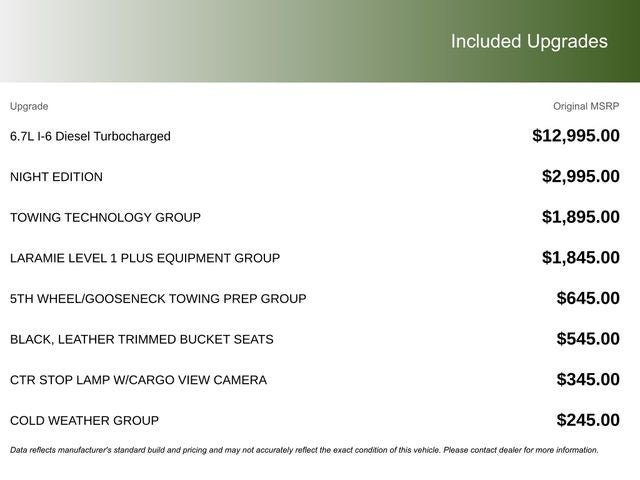 This vehicle comes with the following features and options:Cold Weather Group (Engine Block Heater and MOPAR Winter Front Grille Cover), Laramie Level 1 Plus Equipment Group (#1 Seat Foam Cushion, 115V Auxiliary Rear Power Outlet, 2 Way Rear Headrest Seat, 2nd Row in Floor Storage Bins, 4 Way Front Headrests, Active Lane Management System, Adaptive Steering System, Anti-Spin Differential Rear Axle, Auto Adjust in Reverse Exterior Mirrors, Auto Dim Exterior Mirror, Auto High Beam Headlamp Control, Auto Power-Folding Mirrors, Auto-Dimming Exterior Passenger Mirror, Bucket Seats, Center Stop Lamp with Cargo View Camera, Chrome Exterior Mirrors, Drowsy Driver Detection, Dual Wireless Charging Pad, Exterior Mirrors Courtesy Lamps, Exterior Mirrors with Heating Element, Exterior Mirrors with Memory, Exterior Mirrors with Supplemental Signals, Foam Bottle Insert (door Trim Panel), Folding Flat Load Floor Storage, Forward and Reverse Utility Lights, Front Seat Back Map Pockets, Full Length Upgraded Floor Console, Heated Front Seats, Heated Steering Wheel, High Back Seats, Leather Trimmed Bucket Seats, LED Bed Lighting, Mirror Running Lights, MOPAR Deployable Bed Step, MOPAR Spray in Bedliner, Power 2-Way Driver Lumbar Adjust, Power 2-Way Passenger Lumbar Adjust, Power Adjust 8-Way Driver Seat, Power Adjust 8-Way Front Passenger Seat, Power Adjust Mirrors, Power Adjustable Pedals with Memory, Power Heated Fold Telescopic Mirrors with Memory, Power Telescoping Mirrors, Power-Adjustable Convex Aux Mirrors, Radio/Driver Seat/Mirrors/Pedals Memory, Rain Sensitive Windshield Wipers, Rear 60/40 Folding Seat, Remote Tailgate Release, Traffic Sign Recognition, and Ventilated Front Seats), Night Edition (Black Exterior Mirrors, Black Exterior Truck Badging, Black Wheel Center Hub, Body Color Grille-Surround, Gloss Black Grille Billets/Accents, Sport Performance Hood, and Wheels: 20 x 8.0 Black Painted Aluminum), Quick Order Package 24H Laramie, Towing Technology Group (MOPAR Trailer Camera Wiring with No Camera, Surround View Camera System, Trailer Reverse Guidance, and Trailer Tire Pressure Monitoring System), 10 Speakers, 4-Wheel Disc Brakes, 4G LTE Wi-Fi Hot Spot, 5th Wheel/Gooseneck Towing Prep Group, ABS brakes, Air Conditioning, Alexa Built-in, Alloy wheels, AM/FM radio: SiriusXM with 360L, Apple CarPlay, Apple CarPlay/Android Auto, Auto-dimming Rear-View mirror, Automatic temperature control, Brake assist, Bumpers: body-color, Compass, Connected Travel and Traffic Services, Connectivity - US/Canada, Dash Pass Thru Wire Circuits, Delay-off headlights, Disassociated Touchscreen Display, Driver door bin, Driver vanity mirror, Dual front impact airbags, Dual front side impact airbags, Electronic Stability Control, Emergency Vehicle Alert System (EVAS), For Details, Visit DriveUconnect.com, For More Info, Call 800-643-2112, Front anti-roll bar, Front Center Armrest w/Storage, Front dual zone A/C, Front fog lights, Front reading lights, Fully automatic headlights, Garage door transmitter, Global Telematics Box Module, Google Android Auto, GPS Antenna Input, GPS Navigation, HD Radio, Heated door mirrors, Heated front seats, Heated steering wheel, Illuminated entry, Instrument Panel Mounted Auxiliary Switches, Integrated Voice Command with Bluetooth®, Leather Trim 40/20/40 Bench Seat, Low tire pressure warning, MOPAR Front and Rear Rubber Floor Mats, Navigation System, Occupant sensing airbag, Off-Road Info Pages, Outside temperature display, Overhead airbag, Overhead console, Panic alarm, ParkView Rear Back-Up Camera, Passenger door bin, Passenger vanity mirror, Power door mirrors, Power driver seat, Power passenger seat, Power steering, Power windows, Radio data system, Radio: Uconnect 5 Navigation with 12.0 Display, Rear anti-roll bar, Rear reading lights, Rear seat center armrest, Rear step bump Price includes: $1000 - 2026 National Bonus Cash . Exp. 03/0