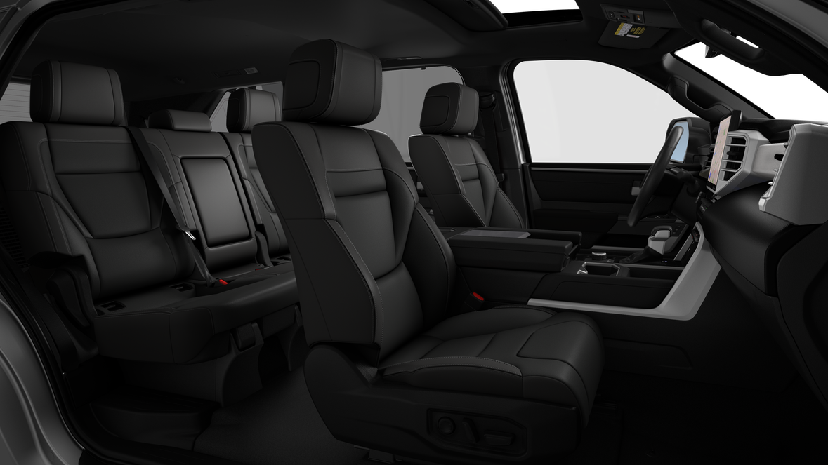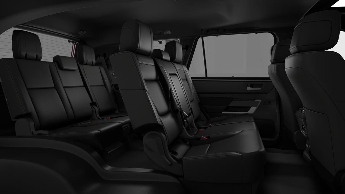 - Leather-trimmed 60/40 split, sliding, power-reclining, power fold-down third-row seats with adjustable headrests
