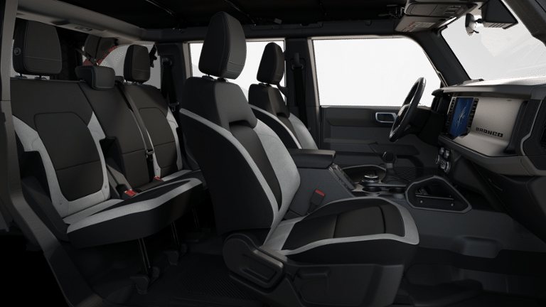 The Bronco's rugged yet refined interior features Cloth Bucket Seats, a Leather Shift Knob, and Ambient Footwell Lighting, creating a comfortable and stylish environment. The advanced technology suite, including SYNC 4, Connected Navigation, and FordPass Connectivity, keeps you connected and in control.