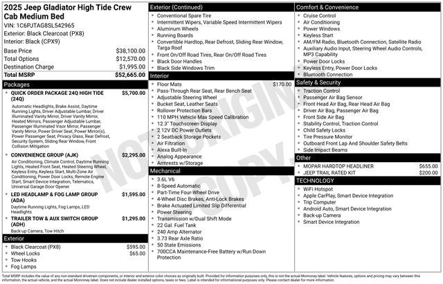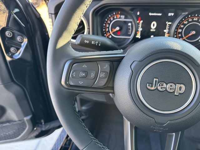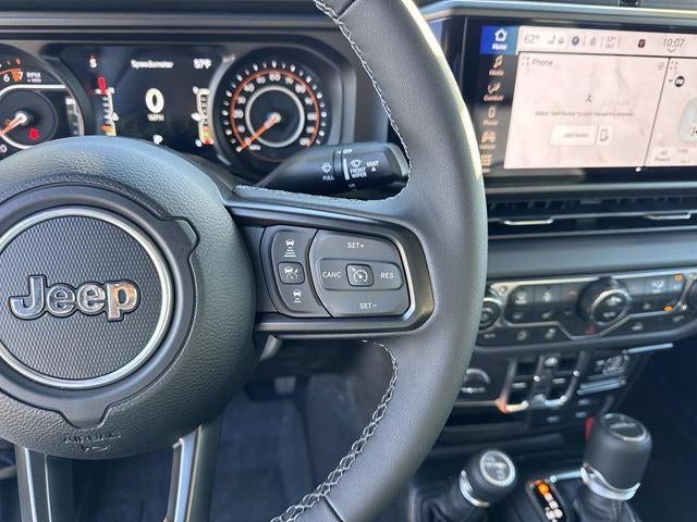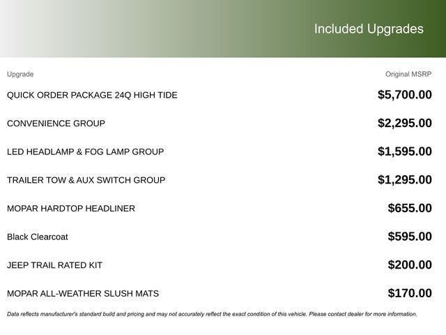 This vehicle comes with the following features and options:Convenience Group (Corning Gorilla Glass, Daytime Running Lamp System, Emergency/Assistance Call, Front Door Locks 2-Door Passive Entry, Heated Front Seats, Heated Steering Wheel, Remote Start System, and Universal Garage Door Opener), LED Headlamp & Fog Lamp Group (Daytime Running Lamps LED Accents, Front LED Fog Lamps, and LED Premium Reflector Headlamps), Quick Order Package 24Q High Tide (97 MPH Vehicle Max Speed Calibration, Advanced Brake Assist, Automatic Headlamps, Body Color 3-Piece Hard Top, Body Color Fender Flares (2-Piece), Deep Tint Sunscreen Windows, Freedom Panel Storage Bag, Full Length Floor Console Premium Armrest, Full Speed Forward Collision Warning Plus, Hard Seat Back, High Tide, High Tide Tailgate & Hood Decals, Integrated Radar Camera Module (IRCM), Leather Wrapped Park Brake Handle, Leather Wrapped Shift Knob, Power 4-Way Driver Lumbar Adjust, Power 4-Way Passenger Lumbar Adjust, Power Adjust 8-Way Driver Seat, Power Adjust 8-Way Front Passenger Seat, Power Heated Mirrors, Premium Door Trim Panel, Premium McKinley Trimmed Seats, Premium Wrapped Steering Wheel, Rear Armrest w/Cupholder Seat, Rear Sliding Window, Rear Window Defroster, Security Alarm, Sun Visors w/Illuminated Vanity Mirrors, Wheels: 17 x 7.5 Painted Black, and Willys Suspension), Trailer Tow & Aux Switch Group (Auxiliary Switches, Class IV Receiver Hitch, Heavy-Duty Engine Cooling, and Trailer Hitch Zoom), 110 MPH Vehicle Max Speed Calibration, 12.3 Touchscreen Display, 3.73 Rear Axle Ratio, 4-Wheel Disc Brakes, 4G LTE Wi-Fi Hot Spot, 8 Speakers, ABS brakes, Air Conditioning, Alexa Built-In, AM/FM radio: SiriusXM, Apple CarPlay, Apple CarPlay/Android Auto, Brake assist, Cloth Low-Back Bucket Seats, Compass, Connectivity - US/Canada, Delay-off headlights, Driver door bin, Driver vanity mirror, Dual front impact airbags, Dual front side impact airbags, Electronic Stability Control, Front anti-roll bar, Front Bucket Seats, Front Center Armrest w/Storage, Front fog lights, Front reading lights, Google Android Auto, Illuminated entry, Integrated roll-over protection, Jeep Trail Rated Kit, Low tire pressure warning, MOPAR All-Weather Slush Mats, MOPAR Hardtop Headliner, Normal Duty Suspension, Occupant sensing airbag, Outside temperature display, Overhead airbag, Panic alarm, ParkView Rear Back-Up Camera, Passenger door bin, Passenger vanity mirror, Power steering, Power windows, Radio data system, Radio: Uconnect 5 w/12.3 Display, Rear anti-roll bar, Rear reading lights, Remote keyless entry, Side Steps, Speed control, Split folding rear seat, Steering wheel mounted audio controls, Tachometer, Telescoping steering wheel, Tilt steering wheel, Traction control, Trip computer, USB Host Flip, Variably intermittent wipers, Voltmeter, and Wheels: 17 x 7.5 Black Steel Styled.