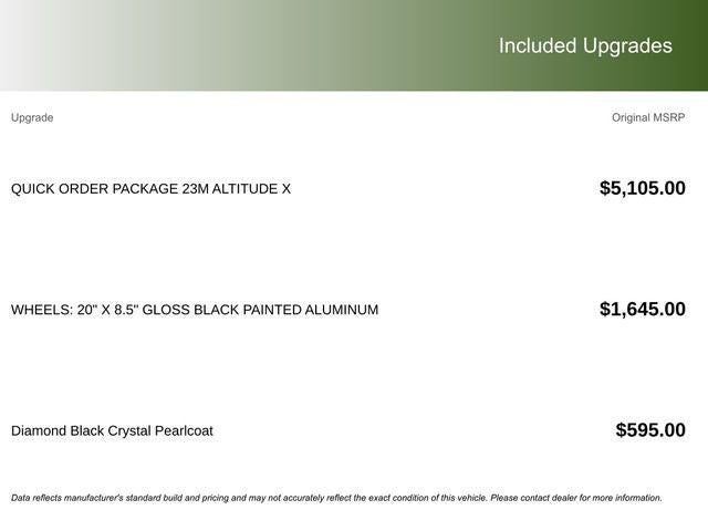 This vehicle comes with the following features and options:Quick Order Package 23M Altitude X (115V Auxiliary Power Outlet, Altitude X, Black Headliner, Capri Leatherette/Suede Seats, Delete Laredo Badge, Gloss Black Exterior Accents, Heated Front Seats, Heated Steering Wheel, Power Liftgate, Power Sunroof, Rain Sensitive Windshield Wipers, Remote Start System, Selectable Tire Fill Alert, Wheels: 18 x 8 Fully Painted Aluminum 1, and Wireless Charging Pad), 4-Wheel Disc Brakes, 6 Speakers, ABS brakes, Air Conditioning, Alloy wheels, AM/FM radio: SiriusXM, Anti-whiplash front head restraints, Automatic temperature control, Brake assist, Bumpers: body-color, Cloth Seats, Compass, Delay-off headlights, Driver door bin, Driver vanity mirror, Dual front impact airbags, Dual front side impact airbags, Electronic Stability Control, Emergency communication system, Four wheel independent suspension, Front anti-roll bar, Front Bucket Seats, Front Center Armrest w/Storage, Front dual zone A/C, Front reading lights, Fully automatic headlights, Heated door mirrors, Illuminated entry, Knee airbag, Low tire pressure warning, Model Year Tracking, Normal Duty Suspension, Occupant sensing airbag, Outside temperature display, Overhead airbag, Overhead console, Panic alarm, ParkView Rear Back-Up Camera, Passenger door bin, Passenger vanity mirror, Power door mirrors, Power driver seat, Power steering, Power windows, Radio data system, Radio: Uconnect 5 with 8.4 Display, Rear anti-roll bar, Rear reading lights, Rear window defroster, Rear window wiper, Remote keyless entry, Security system, Speed control, Speed-Sensitive Wipers, Split folding rear seat, Spoiler, Steering wheel mounted audio controls, Tachometer, Telescoping steering wheel, Tilt steering wheel, Traction control, Trip computer, Variably intermittent wipers, Voltmeter, Wheels: 17 x 6.5 Fully Painted Aluminum, and Wheels: 20 x 8.5 Gloss Black Painted Aluminum.