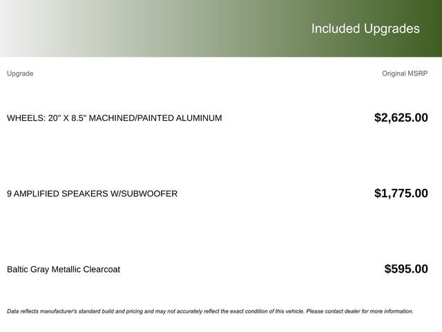 This vehicle comes with the following features and options:Quick Order Package 22E, 4-Wheel Disc Brakes, 506 Watt Amplifier, 6 Speakers, 9 Amplified Speakers with Subwoofer, ABS brakes, Active Noise Control System, Air Conditioning, Alloy wheels, AM/FM radio: SiriusXM with 360L, Anti-whiplash front head restraints, Audio memory, Auto High-beam Headlights, Automatic temperature control, Brake assist, Bumpers: body-color, Capri Leatherette Seats, Compass, Delay-off headlights, Driver door bin, Driver vanity mirror, Dual front impact airbags, Dual front side impact airbags, Electronic Stability Control, Emergency communication system, Four wheel independent suspension, Front anti-roll bar, Front Bucket Seats, Front Center Armrest w/Storage, Front dual zone A/C, Front fog lights, Front reading lights, Fully automatic headlights, Garage door transmitter, Heated door mirrors, Heated front seats, Heated rear seats, Heated steering wheel, Illuminated entry, Knee airbag, Low tire pressure warning, Memory seat, Model Year Tracking, Navigation System, Normal Duty Suspension, Occupant sensing airbag, Outside temperature display, Overhead airbag, Overhead console, Panic alarm, ParkView Rear Back-Up Camera, Passenger door bin, Passenger vanity mirror, Power door mirrors, Power driver seat, Power Liftgate, Power passenger seat, Power steering, Power windows, Radio data system, Radio: Uconnect 5 Nav with 10.1 Display, Rear anti-roll bar, Rear reading lights, Rear window defroster, Rear window wiper, Remote keyless entry, Security system, Speed control, Speed-Sensitive Wipers, Split folding rear seat, Spoiler, Steering wheel mounted audio controls, Tachometer, Telescoping steering wheel, Tilt steering wheel, Traction control, Trip computer, Turn signal indicator mirrors, Variably intermittent wipers, Voltmeter, Wheels: 18 x 8 Polished/Painted Aluminum, and Wheels: 20 x 8.5 Machined/Painted Aluminum.