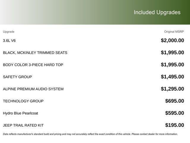 This vehicle comes with the following features and options:Quick Order Package 24G Sahara, Safety Group (Auto High Beam Headlamp Control, Blind Spot & Cross Path Detection, and ParkSense Rear Park Assist System), Technology Group (12.3 Touchscreen Display, 4G LTE Wi-Fi Hot Spot, Apple CarPlay, Auto-Dimming Rear-View Mirror, Connected Travel & Traffic Services, Connectivity - US/Canada, Google Android Auto, GPS Navigation, HD Radio, Integrated Off-Road Camera, Integrated Voice Command w/Bluetooth®, Radio: Uconnect 5 Nav w/12.3 Display, SiriusXM Radio Service, SiriusXM w/360L, and Universal Garage Door Opener), 110 MPH Vehicle Max Speed Calibration, 3.45 Overall Top Gear Ratio, 4-Wheel Disc Brakes, 8 Speakers, ABS brakes, Air Conditioning, Alloy wheels, Alpine Premium Audio System, AM/FM radio: SiriusXM, Apple CarPlay/Android Auto, Automatic temperature control, Aux Battery, Body Color 3-Piece Hard Top, Brake assist, Cloth Low-Back Bucket Seats, Compass, Delay-off headlights, Driver door bin, Driver vanity mirror, Dual front impact airbags, Dual front side impact airbags, Electronic Stability Control, Emergency communication system: Jeep Connect, Freedom Panel Storage Bag, Front anti-roll bar, Front Bucket Seats, Front Center Armrest w/Storage, Front dual zone A/C, Front fog lights, Front reading lights, Fully automatic headlights, Heated door mirrors, Heated front seats, Heated steering wheel, Heavy Duty Suspension w/Gas Shocks, Illuminated entry, Integrated Center Stack Radio, Integrated roll-over protection, Jeep Trail Rated Kit, Low tire pressure warning, Non-Lock Fuel Cap w/o Discriminator, Occupant sensing airbag, Outside temperature display, Overhead airbag, Panic alarm, ParkView Rear Back-Up Camera, Passenger door bin, Passenger vanity mirror, Power door mirrors, Power steering, Power windows, Radio data system, Radio: Uconnect 5 w/12.3 Display, Rear anti-roll bar, Rear reading lights, Rear Window Defroster, Rear Window Wiper/Washer, Remote keyless entry, Security system, Side Steps, Speed control, Split folding rear seat, Steering wheel mounted audio controls, Stop-Start Dual Battery System, Tachometer, Telescoping steering wheel, Tilt steering wheel, Traction control, Trip computer, Variably intermittent wipers, Voltmeter, and Wheels: 18 x 7.5 Machine/Painted Gray.