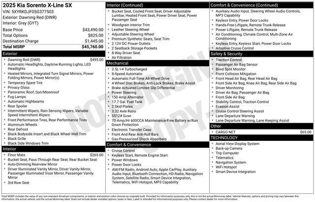 X-Line SX AWD 8 Speed Dual Clutch 2.5L I4 DGI Turbocharged DOHC 16V LEV3-SULEV30 281hp Price includes: $1000 - Sticker Sales Event Retail Bonus Cash. Exp. 01/02/2026 $2500 - KFA Dealer Choice Program: $2500 discount and 5.25% APR for 36 months. $30.08 per $1000 financed. Available to well qualified buyers who finance through Kia Finance America. 506. Exp. 01/02/2026