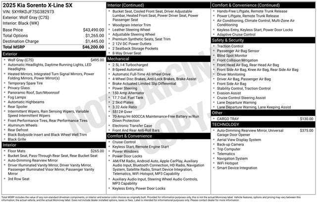 X-Line SX AWD 8 Speed Dual Clutch 2.5L I4 DGI Turbocharged DOHC 16V LEV3-SULEV30 281hp Price includes: $1000 - Sticker Sales Event Retail Bonus Cash. Exp. 01/02/2026 $2500 - KFA Dealer Choice Program: $2500 discount and 5.25% APR for 36 months. $30.08 per $1000 financed. Available to well qualified buyers who finance through Kia Finance America. 506. Exp. 01/02/2026