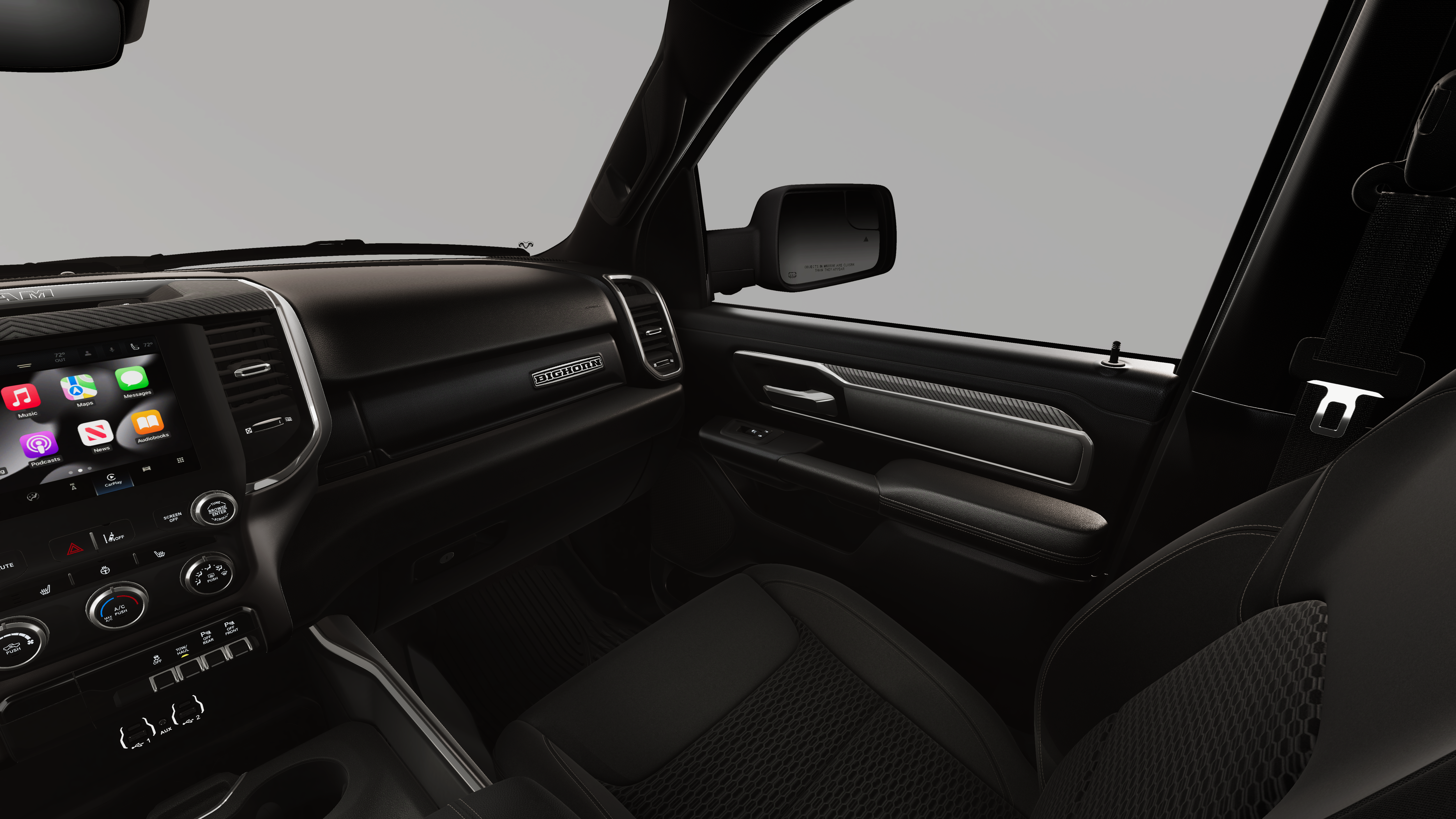 This vehicle comes with the following features and options:Big Horn Level 1 Equipment Group (115V Auxiliary Power Outlet, 2nd Row in Floor Storage Bins, 3 Rear Seat Head Restraints, 4 Way Front Headrests, 400W Inverter, Auto Power-Folding Mirrors, Auto-Dimming Exterior Driver Mirror, Auto-Dimming Rear-View Mirror, Black Exterior Mirrors, Black Premium Power Mirrors, Body Color Fender Flares, Bucket Seats, Center Console Parts Module, Convex Wide-Angle Exterior Mirror Insert, Deluxe Cloth Bucket Seats, Exterior Mirrors Courtesy Lamps, Exterior Mirrors with Heating Element, Exterior Mirrors with Supplemental Signals, Front Seat Back Map Pockets, Full Length Floor Console, Glove Box Lamp, Heated Front Seats, Heated Steering Wheel, Leather Wrapped Steering Wheel, Manual Adjust 4-Way Front Passenger Seat, Power 2-Way Driver Lumbar Adjust, Power Adjust 8-Way Driver Seat, Power Adjustable Pedals, Rear 60/40 Folding Seat, Rear Center Armrest, Rear Dome with on/Off Switch Lamp, Rear Power Sliding Window, Rear Window Defroster, SiriusXM Radio Service, SiriusXM Satellite Radio, Steering Wheel Mounted Audio Controls, Sun Visors with Illuminated Vanity Mirrors, and Universal Garage Door Opener), Quick Order Package 21Z Big Horn, 3.21 Rear Axle Ratio, 4-Wheel Disc Brakes, 48V Belt Starter Generator, 4G LTE Wi-Fi Hot Spot, 6 Speakers, ABS brakes, Air Conditioning, Alloy wheels, AM/FM radio, Anti-Spin Differential Rear Axle, Apple CarPlay, Apple CarPlay/Android Auto, Auto High-beam Headlights, Brake assist, Bumpers: chrome, Cloth Bucket Seats, Compass, Connectivity - US/Canada, Delay-off headlights, Driver door bin, Dual front impact airbags, Dual front side impact airbags, Electronic Stability Control, Exterior Parking Camera Rear, Front anti-roll bar, Front Bucket Seats, Front Center Armrest w/Storage, Front fog lights, Front reading lights, Front wheel independent suspension, Fully automatic headlights, Global Telematics Box Module, Google Android Auto, GPS Antenna Input, Heated door mirrors, Illuminated entry, Integrated Center Stack Radio, Integrated Voice Command with Bluetooth®, Low tire pressure warning, Manual Adjust 4-Way Driver Seat, Manual Folding Exterior Mirrors, MOPAR Front and Rear Rubber Floor Mats, MyFlexCare Service Plan, Occupant sensing airbag, Outside temperature display, Overhead airbag, Overhead console, Panic alarm, Passenger door bin, Passenger vanity mirror, Power door mirrors, Power steering, Power windows, Radio data system, Radio: Uconnect 5 W with 8.4 Display, RAM Grille Badge - Chrome, Rear anti-roll bar, Rear step bumper, Remote keyless entry, Speed control, Supplier Part Tracking (J-1), Tachometer, Telescoping steering wheel, Tilt steering wheel, Traction control, Trip computer, USB Host Flip, Variably intermittent wipers, Voltmeter, and Wheels: 18 x 8 Cast-Aluminum Painted.