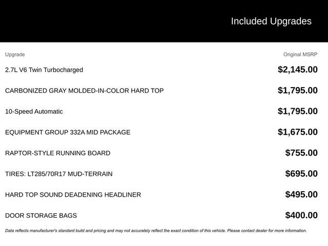WE DELIVER ANYWHERE, 4-Wheel Disc Brakes, 4.7 Axle Ratio, 7 Speakers, ABS brakes, Air Conditioning, Alloy wheels, AM/FM radio: SiriusXM with 360L, AM/FM Stereo, Auto High-beam Headlights, Auto-dimming Rear-View mirror, Brake assist, Compass, Connected Navigation, Delay-off headlights, Driver door bin, Driver vanity mirror, Dual front impact airbags, Dual front side impact airbags, Electronic Stability Control, Emergency communication system: 911 Assist, Exterior Parking Camera Rear, Front anti-roll bar, Front Bucket Seats, Front Center Armrest, Front fog lights, Front reading lights, Front wheel independent suspension, Fully automatic headlights, Heated door mirrors, Heated front seats, Heated steering wheel, Illuminated entry, Integrated roll-over protection, Leather Shift Knob, Low tire pressure warning, Marine Grade Vinyl Heated Bucket Seats, Occupant sensing airbag, Outside temperature display, Overhead airbag, Overhead console, Panic alarm, Passenger door bin, Passenger vanity mirror, Power door mirrors, Power steering, Power windows, Radio data system, Remote keyless entry, Security system, SiriusXM w/360L, Speed control, Split folding rear seat, Steering wheel mounted audio controls, SYNC 4, Tachometer, Telescoping steering wheel, Tilt steering wheel, Traction control, Trip computer, Variably intermittent wipers, Voltmeter.