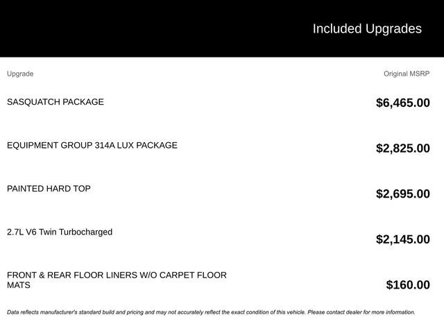 WE DELIVER ANYWHERE, 18 Bright Machined Aluminum Wheels, 360-Degree Camera, 4-Wheel Disc Brakes, 7 Speakers, ABS brakes, Adaptive Cruise Control, Air Conditioning, Alloy wheels, AM/FM radio: SiriusXM with 360L, AM/FM Stereo, Auto High-beam Headlights, Auto-dimming Rear-View mirror, Automatic temperature control, Brake assist, Compass, Connected Navigation, Delay-off headlights, Driver door bin, Driver vanity mirror, Dual front impact airbags, Dual front side impact airbags, Electronic Stability Control, Emergency communication system: 911 Assist, Equipment Group 314A Lux Package, Evasive Steering Assist, Exterior Parking Camera Rear, Front & Rear Floor Liners w/o Carpet Floor Mats, Front anti-roll bar, Front Bucket Seats, Front Center Armrest, Front dual zone A/C, Front fog lights, Front Parking Sensors, Front reading lights, Front wheel independent suspension, Fully automatic headlights, Hard Top Sound Deadening Headliner, Heated door mirrors, Heated front seats, Heated Leather-Trimmed/Vinyl Bucket Seats, Heated steering wheel, High Clearance Fender Flares, High Clearance Suspension, Illuminated entry, Information on Demand Panel, Integrated roll-over protection, Leather Shift Knob, Low tire pressure warning, Navigation system: Connected Navigation, Occupant sensing airbag, Outside temperature display, Overhead airbag, Overhead console, Painted Hard Top, Panic alarm, Passenger door bin, Passenger vanity mirror, Position-Sensitive Bilstein Shock Absorbers, Power door mirrors, Power driver seat, Power passenger seat, Power steering, Power windows, Radio data system, Radio: B&O Sound System by Bang & Olufsen, Rear seat center armrest, Rear-Window Defroster & Washer, Remote keyless entry, Sasquatch Package, Security system, Sideview Mirrors, SiriusXM w/360L, Speed control, Split folding rear seat, Steering wheel mounted audio controls, SYNC 4, Tachometer, Telescoping steering wheel, Tilt steering wheel, Traction control, Trip computer, Universal Garage Door Opener, Variably intermittent wipers, Voltmeter, Wheels: 17 Carbonized Gray Painted Aluminum.