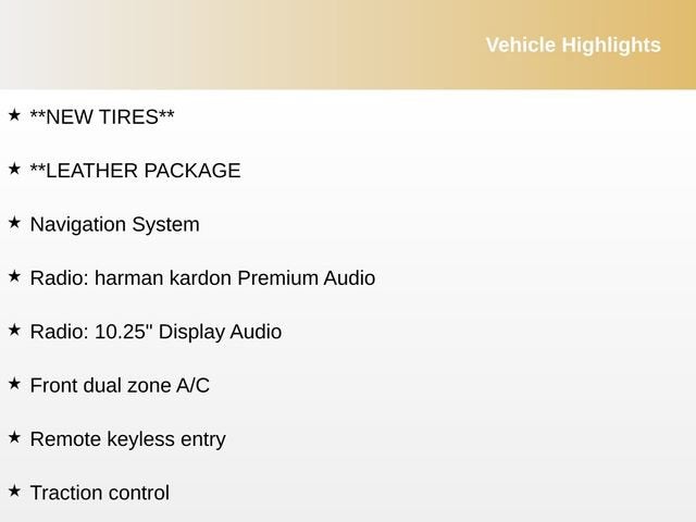 **NEW TIRES**, **LEATHER PACKAGE, 18 x 7.5J Alloy Wheels, Apple CarPlay & Android Auto, Exterior Parking Camera Rear, Front dual zone A/C, Navigation System, Radio: 10.25 Display Audio, Radio: harman kardon Premium Audio, Remote keyless entry, Speed control, Traction control.