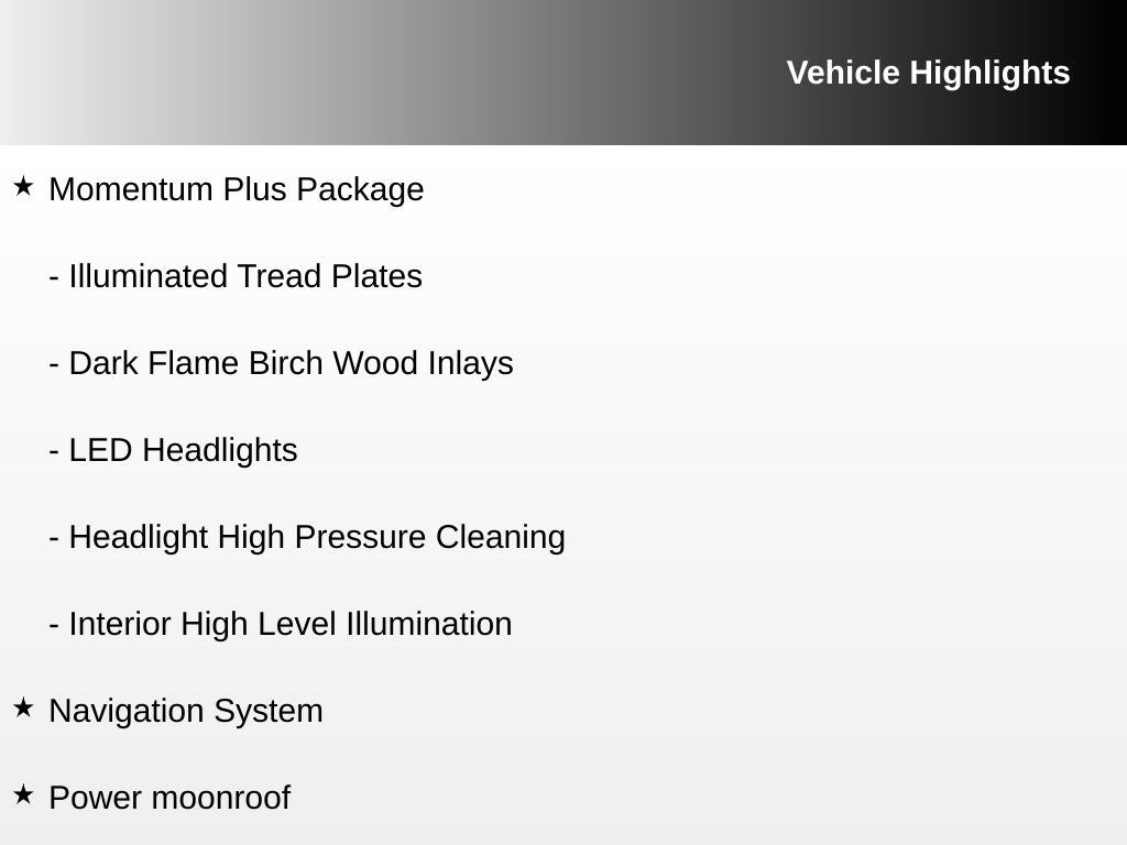 - Momentum Plus Package: Elevating your driving experience with interior high-level illumination, illuminated tread plates, LED headlights with active bending lights and Thor's Hammer daytime running lights, dark flame birch wood inlays, and headlight high-pressure cleaning