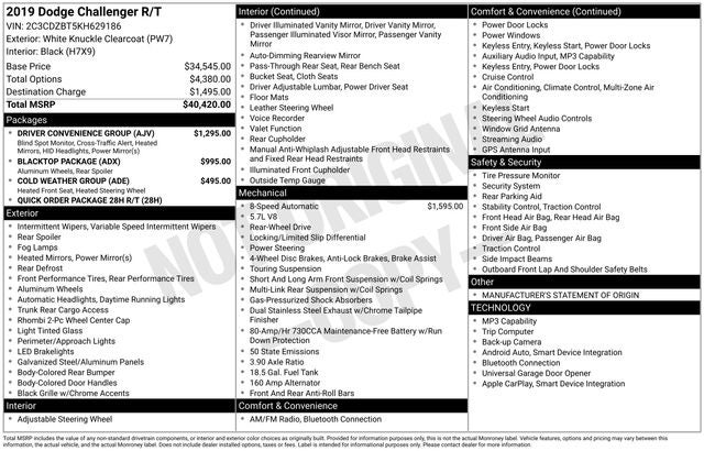 White Knuckle Clearcoat 2019 Dodge Challenger R/T RWD 8-Speed Automatic HEMI 5.7L V8 Multi Displacement VVT 4-Wheel Disc Brakes, 6 Speakers, ABS brakes, Air Conditioning, Alloy wheels, AM/FM radio, Anti-whiplash front head restraints, Apple CarPlay, Apple CarPlay/Android Auto, Auto-dimming Rear-View mirror, Automatic temperature control, Black Grille w/Bezel, Blacktop Package, Blacktop R/T Badge, Brake assist, Bumpers: body-color, Challenger Blacktop Grille Badge, Cold Weather Group, Compass, Delay-off headlights, Driver Convenience Group, Driver door bin, Driver vanity mirror, Dual front impact airbags, Dual front side impact airbags, Electronic Stability Control, Four wheel independent suspension, Front anti-roll bar, Front Bucket Seats, Front Center Armrest, Front dual zone A/C, Front fog lights, Front reading lights, Fully automatic headlights, Garage door transmitter, Gloss Black I/P Cluster Trim Rings, Google Android Auto, GPS Antenna Input, Heated door mirrors, Houndstooth Cloth Performance Seats, Illuminated entry, Integrated Voice Command w/Bluetooth®, Leather Shift Knob, Low tire pressure warning, Media Hub (2 USB, AUX), Outside temperature display, Overhead airbag, Overhead console, Panic alarm, ParkView Rear Back-Up Camera, Passenger door bin, Passenger vanity mirror, Power door mirrors, Power driver seat, Power steering, Power windows, Quick Order Package 28H R/T, Radio data system, Radio: Uconnect 4 w/7 Display, Rear anti-roll bar, Rear reading lights, Rear seat center armrest, Rear window defroster, Remote keyless entry, Rhombi 2-Pc Wheel Center Cap, Security system, Speed control, Speed-sensing steering, Split folding rear seat, Spoiler, Sport steering wheel, Steering wheel mounted audio controls, Tachometer, Telescoping steering wheel, Tilt steering wheel, Traction control, Trip computer, USB Host Flip, Variably intermittent wipers, Wheels: 20 x 8.0 Black Noise Painted, Wheels: 20 x 8.0 Granite Crystal Aluminum.