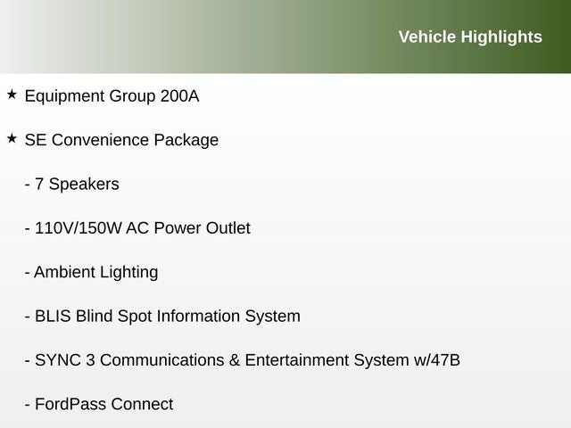 - SYNC 3 Communications & Entertainment System -inc: enhanced voice recognition, 6.5" LCD capacitive touchscreen in center stack w/swipe capability, AppLink, 911 Assist, Apple CarPlay, Android Auto and 2 smart-charging USB ports