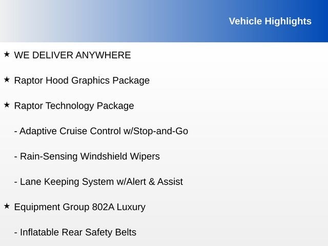 Magnetic 2019 Ford F-150 Raptor 4WD 10-Speed Automatic 3.5L V6 EcoBoost WE DELIVER ANYWHERE, 4WD, 360 Degree Camera, 4.10 Front Axle w/Torsen Differential, 8 Productivity Screen, Adaptive Cruise Control w/Stop-and-Go, Advanced Security Pack, Ambient Lighting - Ice Blue Color Only, BLIS Blind Spot Information System, Dual-Zone Electronic Automatic Temperature Control, Equipment Group 802A Luxury, GVWR: 7,050 lbs Payload Package, Heated & Ventilated Leather 40/Console/40 Front Seats, Heated Steering Wheel, Inflatable Rear Safety Belts, Integrated Trailer Brake Controller, Intelligent Access w/Push-Button Start, Lane Keeping System w/Alert & Assist, LED Box Lighting, LED Sideview Mirror Spotlights, Memory System (Seat, Pedal, Exterior Mirror), Power Glass Heated Sideview Mirrors, Power Tilt/Telescoping Steering Column w/Memory, Power-Adjustable Pedals, Power-Sliding Rear Window, Pro Trailer Backup Assist, Radio: B&O Sound System by Bang & Olufsen, Rain-Sensing Windshield Wipers, Raptor Hood Graphics Package, Raptor Technology Package, Remote Start System w/Remote Tailgate Release, Tailgate Applique FORD, Universal Garage Door Opener, Voice-Activated Touchscreen Navigation, 10-Way Power Driver & Passenger Seats, 17 Cast Aluminum Wheels, 4-Wheel Disc Brakes, 7 Speakers, 8-Way Power Driver's Seat w/Power Lumbar, ABS brakes, Air Conditioning, Alloy wheels, AM/FM radio: SiriusXM, AppLink/Apple CarPlay and Android Auto, Auto High-beam Headlights, Auto-dimming Rear-View mirror, Brake assist, Compass, Delay-off headlights, Driver door bin, Driver vanity mirror, Dual front impact airbags, Dual front side impact airbags, Electronic Locking w/4.10 Axle Ratio, Electronic Stability Control, Emergency communication system: SYNC 3 911 Assist, Exterior Parking Camera Rear, Front anti-roll bar, Front Bucket Seats, Front Center Armrest, Front License Plate Bracket, Front reading lights, Front wheel independent suspension, Fully automatic headlights, Heated Leather 40/Console/40 Front Seats, Illuminated entry, Leather steering wheel, Low tire pressure warning, Occupant sensing airbag, Outside temperature display, Overhead airbag, Overhead console, Panic alarm, Passenger door bin, Passenger vanity mirror, Power door mirrors, Power driver seat, Power steering, Power windows, Radio data system, Radio: SiriusXM w/7 Speakers, Rear Parking Sensors, Rear reading lights, Rear step bumper, Rear window defroster, Remote keyless entry, Second-Row Heated Seats, Security system, Speed control, Speed-sensing steering, Split folding rear seat, Steering wheel mounted audio controls, SYNC 3, Tachometer, Tailgate Step w/Tailgate Lift Assist, Telescoping steering wheel, Tilt steering wheel, Tough Bed Spray-In Bedliner, Traction control, Trip computer, Twin Panel Moonroof, Unique Cloth Trim Seats, Variably intermittent wipers, 4WD, 360 Degree Camera, 4.10 Front Axle w/Torsen Differential, 8 Productivity Screen, Adaptive Cruise Control w/Stop-and-Go, Advanced Security Pack, Ambient Lighting - Ice Blue Color Only, BLIS Blind Spot Information System, Dual-Zone Electronic Automatic Temperature Control, Equipment Group 802A Luxury, GVWR: 7,050 lbs Payload Package, Heated & Ventilated Leather 40/Console/40 Front Seats, Heated Steering Wheel, Inflatable Rear Safety Belts, Integrated Trailer Brake Controller, Intelligent Access w/Push-Button Start, Lane Keeping System w/Alert & Assist, LED Box Lighting, LED Sideview Mirror Spotlights, Memory System (Seat, Pedal, Exterior Mirror), Power Glass Heated Sideview Mirrors, Power Tilt/Telescoping Steering Column w/Memory, Power-Adjustable Pedals, Power-Sliding Rear Window, Pro Trailer Backup Assist, Radio: B&O Sound System by Bang & Olufsen, Rain-Sensing Windshield Wipers, Raptor Hood Graphics Package, Raptor Technology Package, Remote Start System w/Remote Tailgate Release, Tailgate Applique FORD, Universal Garage Door Opener, Voice-Activated Touchs