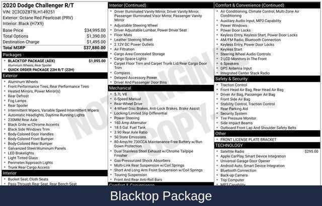 - Blacktop Package: Black Fuel Filler Door, Gloss Black I/P Cluster Trim Rings, Rear Black Spoiler, HEMI Blacktop Fender Badge, Satin Black Dodge Tail Lamp Badge, Blacktop R/T Badge, 20 Black Noise Painted Wheels, Black Grille with Bezel, Challenger Blacktop Grille Badge