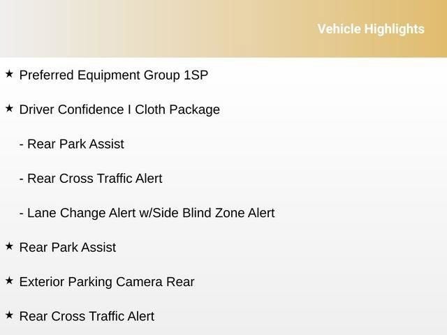 - Driver Confidence Package includes (UD7) Rear Park Assist, (UKC) Lane Change Alert with Side Blind Zone Alert and (UFG) Rear Cross Traffic Alert
