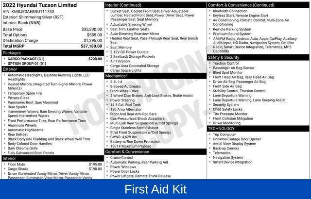 Shimmering Silver 2022 Hyundai Tucson Limited FWD 8-Speed Automatic with SHIFTRONIC 2.5L I4 DGI DOHC 16V LEV3-ULEV70 187hp WE DELIVER ANYWHERE, Cargo Net, Cargo Package, Cargo Tray, First Aid Kit, Option Group 01, 3.648 Axle Ratio, 4-Wheel Disc Brakes, 8 Speakers, ABS brakes, Air Conditioning, Alloy wheels, AM/FM radio: SiriusXM, Apple CarPlay & Android Auto, Auto High-beam Headlights, Auto-dimming Rear-View mirror, Automatic temperature control, Brake assist, Bumpers: body-color, Cargo Cover, Carpeted Floor Mats, Delay-off headlights, Driver door bin, Driver vanity mirror, Dual front impact airbags, Dual front side impact airbags, Electronic Stability Control, Emergency communication system: Blue Link Connected Car Service (3-year complimentary subscription), Four wheel independent suspension, Front anti-roll bar, Front Bucket Seats, Front Center Armrest, Front dual zone A/C, Front reading lights, Fully automatic headlights, Garage door transmitter: HomeLink, Heated & Ventilated Front Bucket Seats, Heated door mirrors, Heated front seats, Heated rear seats, Heated steering wheel, Illuminated entry, Leather Seat Trim, Low tire pressure warning, Memory seat, Navigation System, Occupant sensing airbag, Outside temperature display, Overhead airbag, Overhead console, Panic alarm, Passenger door bin, Passenger vanity mirror, Power door mirrors, Power driver seat, Power Liftgate, Power moonroof, Power passenger seat, Power steering, Power windows, Radio data system, Radio: Bose Premium w/AM/FM/HD/SiriusXM Audio System, Rain sensing wipers, Rear anti-roll bar, Rear reading lights, Rear seat center armrest, Rear window defroster, Rear window wiper, Remote keyless entry, Roof rack: rails only, Security system, Speed control, Split folding rear seat, Spoiler, Steering wheel mounted audio controls, Tachometer, Telescoping steering wheel, Tilt steering wheel, Traction control, Trip computer, Turn signal indicator mirrors, Variably intermittent wipers, Ventilated front seats, Wheels: 19 x 7.5J Machine-Face Finish Alloy, Cargo Net, Cargo Package, Cargo Tray, First Aid Kit, Option Group 01.