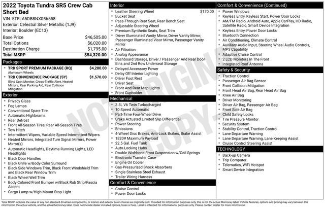 Step inside and you'll be greeted by a spacious and well-appointed interior, featuring SofTex seat trim, a premium audio system, and a user-friendly infotainment system with Apple CarPlay and Android Auto integration. The Tundra's impressive 17 city / 22 highway MPG ratings ensure you can go the distance without frequent stops at the pump.