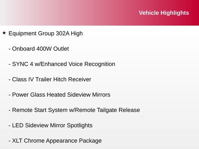 10-Way Power Driver & Passenger Seats, 2-Bar Style Grille w/Chrome 2 Minor Bars, 3.55 Axle Ratio, 8 Productivity Screen in Instrument Cluster, ABS brakes, Auto High-beam Headlights, Bed Utility Package, BoxLink, Bright Polished Step Bars, Chrome Door & Tailgate Handles w/Body-Color Bezel, Chrome Single-Tip Exhaust, Class IV Trailer Hitch Receiver, Compass, Dual Zone Electronic Automatic Temperature Control, Electronic Stability Control, Equipment Group 302A High, Exterior Parking Camera Rear, Front fog lights, GVWR: 6,470 lbs Payload Package, Heated door mirrors, Heated Front Seats, Illuminated entry, Intelligent Access w/Push Button Start, LED Box Lighting, LED Reflector Headlamps, LED Sideview Mirror Spotlights, Low tire pressure warning, Onboard 400W Outlet, Power Glass Heated Sideview Mirrors, Power-Sliding Rear Window, Radio: AM/FM Stereo w/6 Speakers, Rear Under-Seat Storage, Remote keyless entry, Remote Start System w/Remote Tailgate Release, Steering wheel mounted audio controls, SYNC 4, SYNC 4 w/Enhanced Voice Recognition, Tailgate Step w/Tailgate Work Surface, Traction control, Wheels: 20 Chrome-Like PVD, Wrapped Steering Wheel, XLT Chrome Appearance Package, Zone Lighting.