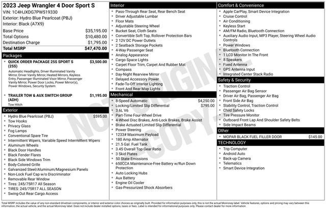 This Wrangler Sport S in the stunning Hydro Blue Pearlcoat color is equipped with a host of features that will elevate your driving experience. The Trailer Tow & Aux Switch Group provides the capability to tow your gear, while the Anti-Spin Differential Rear Axle ensures confident handling on any terrain.