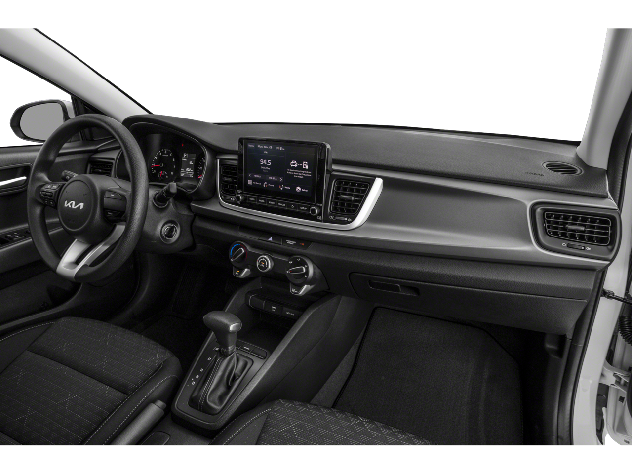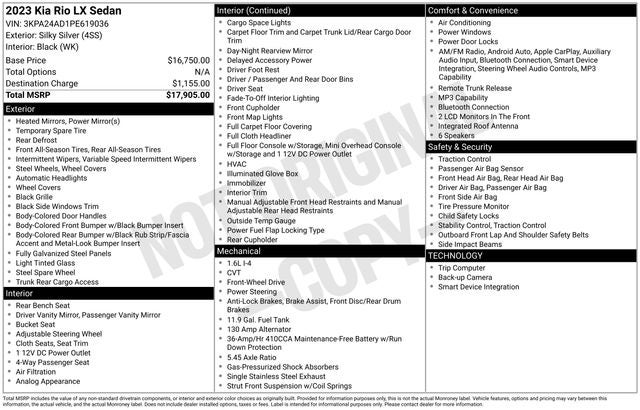 CARFAX One-Owner. Clean CARFAX. Silky Silver 2023 Kia Rio LX FWD CVT 1.6L 4-Cylinder 6 Speakers, ABS brakes, Air Conditioning, AM/FM radio, Brake assist, Bumpers: body-color, Driver door bin, Driver vanity mirror, Dual front impact airbags, Dual front side impact airbags, Electronic Stability Control, Front anti-roll bar, Front Bucket Seats, Front reading lights, Front wheel independent suspension, Fully automatic headlights, Heated door mirrors, Illuminated entry, Low tire pressure warning, Occupant sensing airbag, Outside temperature display, Overhead airbag, Overhead console, Panic alarm, Passenger door bin, Passenger vanity mirror, Power door mirrors, Power steering, Power windows, Radio: AM/FM/MP3 Audio System, Rear window defroster, Speed-sensing steering, Steering wheel mounted audio controls, Tachometer, Tilt steering wheel, Traction control, Trip computer, Variably intermittent wipers, Wheels: 15 x 5.5J Steel w/Full Covers, Woven & Tricot Cloth Seat Trim.