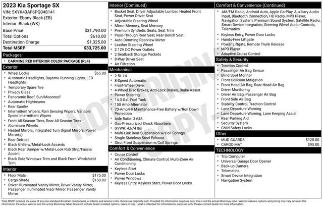 CARFAX One-Owner. Ebony Black 2023 Kia Sportage SX FWD 8-Speed Automatic I4 4-Wheel Disc Brakes, 8 Speakers, ABS brakes, Air Conditioning, Alloy wheels, AM/FM radio: SiriusXM, Apple CarPlay & Android Auto, Auto High-beam Headlights, Auto-dimming Rear-View mirror, Automatic temperature control, Axle Ratio: 3.648, Brake assist, Bumpers: body-color, Cargo Cover, Cargo Mat, Carmine Red Interior Color Package, Carpeted Floor Mats, Compass, Delay-off headlights, Driver door bin, Driver vanity mirror, Dual front impact airbags, Dual front side impact airbags, Electronic Stability Control, Emergency communication system, Four wheel independent suspension, Front anti-roll bar, Front Bucket Seats, Front Center Armrest, Front dual zone A/C, Front reading lights, Fully automatic headlights, Garage door transmitter: HomeLink, harman/kardon® Speakers, Heated door mirrors, Heated Front Bucket Seats, Heated front seats, Illuminated entry, Leather Shift Knob, Leather steering wheel, Leatherette Seat Trim, Low tire pressure warning, Memory seat, Mud Guards, Navigation System, Occupant sensing airbag, Outside temperature display, Overhead airbag, Overhead console, Panic alarm, Passenger door bin, Passenger vanity mirror, Power door mirrors, Power driver seat, Power Liftgate, Power moonroof, Power steering, Power windows, Radio: AM/FM/HD Audio System, Rain sensing wipers, Rear anti-roll bar, Rear reading lights, Rear seat center armrest, Rear window defroster, Rear window wiper, Remote keyless entry, Security system, Speed control, Speed-sensing steering, Split folding rear seat, Spoiler, Steering wheel mounted audio controls, Tachometer, Telescoping steering wheel, Tilt steering wheel, Traction control, Trip computer, Turn signal indicator mirrors, Variably intermittent wipers, Wheel Locks, Wheels: 18 Matte Gray Alloy.