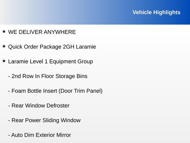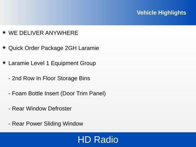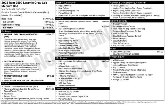 Granite Crystal Metallic Clearcoat 2023 Ram 2500 Laramie 4WD 8-Speed Automatic 6.4L V8 WE DELIVER ANYWHERE, 12 Touchscreen Display, 2nd Row In Floor Storage Bins, 4G LTE Wi-Fi Hot Spot, Adaptive Cruise Control w/Stop, Adaptive Steering System, Alexa Built-In, Apple CarPlay, Auto Adjust In Reverse Exterior Mirrors, Auto Dim Exterior Mirror, Auto High Beam Headlamp Control, Auto Power-Folding Mirrors, Auto-Dimming Exterior Passenger Mirror, Blind Spot & Cross Path Detection, Chrome Exterior Mirrors, Connected Travel & Traffic Services, Connectivity - US/Canada, Disassociated Touchscreen Display, Exterior Mirrors Courtesy Lamps, Exterior Mirrors w/Heating Element, Exterior Mirrors w/Memory, Exterior Mirrors w/Supplemental Signals, Foam Bottle Insert (Door Trim Panel), For Details, Visit DriveUconnect.com, For More Info, Call 800-643-2112, Forward & Reverse Utility Lights, Front LED Fog Lamps, Full Speed Forward Collision Warning Plus, Global Telematics Box Module (TBM), Google Android Auto, GPS Antenna Input, GPS Navigation, HD Radio, Integrated Voice Command w/Bluetooth®, Lane Keep Assist, Laramie Level 1 Equipment Group, LED Reflector Headlamps, Mirror Running Lights, Off-Road Information Pages, ParkSense Front/Rear Park Assist System, Power Adjust Mirrors, Power Adjustable Convex Aux Mirrors, Power Adjustable Pedals w/Memory, Power Heated Fold Telescopic Mirrors w/Memory, Power Telescoping Mirrors, Protection Group, Quick Order Package 2GH Laramie, Radio: Uconnect 5 Nav w/12.0 Display, Radio/Driver Seat/Mirrors/Pedals Memory, Rain Sensitive Windshield Wipers, Rear Power Sliding Window, Rear Window Defroster, Remote Tailgate Release, Safety Group, Selectable Tire Fill Alert, SiriusXM Radio Service, SiriusXM w/360L, Tow Hooks, Trailer Tow Pages, 10 Speakers, 115V Auxiliary Rear Power Outlet, 2 Way Rear Headrest Seat, 20 x 8.0 Polished Aluminum Wheels, 3.73 Axle Ratio, 4 Way Front Headrests, 4-Wheel Disc Brakes, ABS brakes, Active Noise Control System, Air Conditioning, Alloy wheels, AM/FM radio: SiriusXM with 360L, Anti-Spin Differential Rear Axle, Apple CarPlay/Android Auto, Auto-dimming Rear-View mirror, Automatic temperature control, Brake assist, Bumpers: body-color, Center Hub, Clearance Lamps, Compass, Delay-off headlights, Driver door bin, Driver vanity mirror, Dual front impact airbags, Dual front side impact airbags, Electronic Stability Control, Electronically Controlled Throttle, Front anti-roll bar, Front Center Armrest w/Storage, Front dual zone A/C, Front reading lights, Front Seat Back Map Pockets, Fully automatic headlights, Garage door transmitter, Heated door mirrors, Heated Front Seats, Heated front seats, Heated Steering Wheel, Heated steering wheel, Illuminated entry, Leather steering wheel, Leather Trim 40/20/40 Bench Seat, Low tire pressure warning, MOPAR Front & Rear Rubber Floor Mats, Navigation System, Occupant sensing airbag, Outside temperature display, Overhead airbag, Overhead console, Panic alarm, ParkView Rear Back-Up Camera, Passenger door bin, Passenger vanity mirror, Power 2-Way Driver Lumbar Adjust, Power 2-Way Passenger Lumbar Adjust, Power Adjust 8-Way Driver Seat, Power Adjust 8-Way Front Passenger Seat, Power door mirrors, Power driver seat, Power passenger seat, Power steering, Power windows, Radio data system, Radio: Uconnect 5 Nav w/8.4 Display, Rear 60/40 Folding Seat, Rear anti-roll bar, Rear reading lights, Rear seat center armrest, Rear step bumper, Rear window defroster, Remote keyless entry, Security system, Speed control, Split folding rear seat, Steering wheel mounted audio controls, Tachometer, Tilt steering wheel, Tip Start, Traction control, Trip computer, Turn signal indicator mirrors, Variably intermittent wipers, Vendor Painted Cargo Box, Vendor Painted Cargo Box Tracking, Voltmeter, Wheels: 18 x 8.0 Polished Aluminum, 12 Touchscreen Display, 2nd Row In Floor Storage Bins, 4G LTE Wi-Fi Hot Spot, Adaptive Cruise Control w/Stop, Adap
