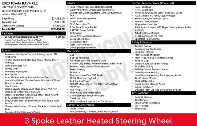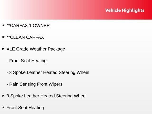 - XLE Grade Weather Package (Front Seat Heating, Rain Sensing Front Wipers, 3 Spoke Leather Heated Steering Wheel)