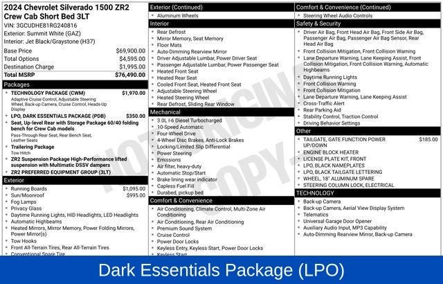 Summit White 2024 Chevrolet Silverado 1500 ZR2 4WD 10-Speed Automatic 3.0L I6 WE DELIVER ANYWHERE, 10-Speed Automatic, 4WD, Jet Black/Graystone Leather, 10-Way Power Driver Seat w/Lumbar, 10-Way Power Passenger Seat Adjuster w/Lumbar, 12.3 Multicolor Reconfigurable Digital Display, 120-Volt Bed Mounted Power Outlet, 120-Volt Interior Power Outlet, 15 Diagonal Multicolor Head-Up Display, 2 USB Data Ports, 2nd Row Heated Outboard Seats, Adaptive Cruise Control, All-Weather Floor Liner (LPO), Auto-Dimming Inside Rear-View Mirror, Bed View Camera, Black Name Plates (LPO), Black Tailgate CHEVROLET Lettering (LPO), Bluetooth® For Phone, Chevrolet Connected Access Capable, Chevytec Spray-On Black Bedliner, Color-Keyed Carpeting Floor Covering, Dark Essentials Package (LPO), Deep-Tinted Glass, Driver Memory, Dual Rear USB Ports (Charge Only), Electric Rear-Window Defogger, Electrical Steering Column Lock, Electronic Cruise Control, EZ Lift Power Lock & Release Tailgate, Floor Mounted Center Console, Front LED Fog Lamps, Front Rain-Sensing Wipers, HD Surround Vision, Heated Driver & Front Outboard Passenger Seats, Heated Steering Wheel, Heavy-Duty Air Filter, High Gloss Black Mirror Caps, Hill Descent Control, Hitch Guidance, Hitch Guidance w/Hitch View, In-Vehicle Trailering System App, Integrated Trailer Brake Controller, Keyless Open & Start, LED Cargo Area Lighting, Manual Tilt/Telescoping Steering Column, OnStar & Chevrolet Connected Services Capable, Outside Heated Power-Adjustable Mirrors, Performance Red Recovery Hooks, Perimeter Lighting, Power Front Passenger Windows w/Express Up/Down, Power Front Windows w/Driver Express Up/Down, Power Rear Windows w/Express Down, Power Sliding Rear Window w/Rear Defogger, Power Tilt & Telescoping Steering Column, Preferred Equipment Group 3LT, Rear Camera Mirror, Rear Cross Traffic Braking, Rear Park Assist, Rear Pedestrian Alert, Rear Wheelhouse Liners, Remote Vehicle Starter System, Safety Alert Seat, SiriusXM w/360L, Standard Tailgate, Steering Wheel Audio Controls, Technology Package, Theft Deterrent System (Unauthorized Entry), Trailer Camera Provisions, Trailer Side Blind Zone Alert, Trailering Package, Universal Home Remote, Up-Level Rear Seat w/Storage Package, Ventilated Driver & Front Passenger Seats, Wi-Fi Hot Spot Capable, Wrapped Steering Wheel, ZR2 Suspension Package, 220 Amp Alternator, 3.23 Rear Axle Ratio, 4-Wheel Disc Brakes, 7 Speakers, 850 Cold-Cranking Amps Heavy-Duty Battery, ABS brakes, Air Conditioning, Alloy wheels, AM/FM radio: SiriusXM with 360L, Auto High-beam Headlights, Auto-dimming door mirrors, Auto-dimming Rear-View mirror, Automatic Emergency Braking, Automatic temperature control, Block heater, Brake assist, Compass, Delay-off headlights, Driver door bin, Driver vanity mirror, Dual Exhaust, Dual front impact airbags, Dual front side impact airbags, Electronic Stability Control, Electronic Transmission Range Selector Shifter, Engine Block Heater, Following Distance Indicator, Forward Collision Alert, Front anti-roll bar, Front Bucket Seats, Front Center Armrest, Front dual zone A/C, Front fog lights, Front License Plate Kit, Front Pedestrian Braking, Front reading lights, Front wheel independent suspension, Fully automatic headlights, Garage door transmitter, Heated door mirrors, Heated front seats, Heated rear seats, Heated steering wheel, Illuminated entry, IntelliBeam Automatic High Beam On/Off, Lane Keep Assist w/Lane Departure Warning, Low tire pressure warning, Memory seat, Occupant sensing airbag, Off-Road Assist Steps (LPO), Outside temperature display, Overhead airbag, Overhead console, Panic alarm, Passenger door bin, Passenger vanity mirror, Perforated Leather Seat Trim, Power door mirrors, Power driver seat, Power passenger seat, Power steering, Power Sunroof, Power Tailgate, Power windows, Premium audio system: Chevrolet Infotainment 3 Premium