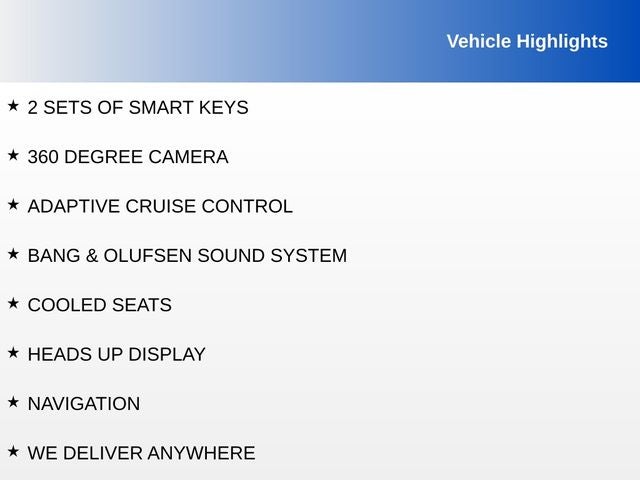 - Radio: B&O Unleashed Sound System by Bang & Olufsen -inc: HD Radio and 14 speakers including subwoofer