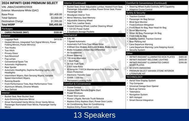 13 Speakers, 3rd row seats: bench, Cargo Package, Console Net, First-Aid Kit, Heated front seats, Leather-Appointed Seats, Moisture-Resistant Rear Cargo Carpet, Navigation system: INFINITI InTouch Navigation, Nylon-Cord Cargo Net, Power Liftgate, Power moonroof, Premium Select Sahara Stone Interior, Radio: Bose Premium Audio System w/13 Speakers, Rear air conditioning, Reclining 3rd row seat, 2.937 Axle Ratio, 4-Wheel Disc Brakes, ABS brakes, Air Conditioning, Alloy wheels, AM/FM radio: SiriusXM, Anti-whiplash front head restraints, Apple CarPlay/Android Auto, Auto High-beam Headlights, Auto tilt-away steering wheel, Auto-dimming door mirrors, Auto-dimming Rear-View mirror, Auto-leveling suspension, Automatic temperature control, Brake assist, Bumpers: body-color, Compass, Delay-off headlights, Driver door bin, Driver vanity mirror, Dual front impact airbags, Dual front side impact airbags, Electronic Stability Control, Emergency communication system: INFINITI InTouch, Four wheel independent suspension, Front anti-roll bar, Front Bucket Seats, Front Center Armrest, Front dual zone A/C, Front fog lights, Front reading lights, Fully automatic headlights, Garage door transmitter: HomeLink, Heated door mirrors, Heated Front Bucket Seats, Heated steering wheel, Illuminated entry, INFINITI Radiant Illuminated Cargo Scuff Plates, INFINITI Radiant Welcome Lighting, Leather Shift Knob, Leather steering wheel, Literature Kit, Low tire pressure warning, Memory seat, Occupant sensing airbag, Outside temperature display, Overhead airbag, Overhead console, Panic alarm, Passenger door bin, Passenger vanity mirror, Power door mirrors, Power driver seat, Power passenger seat, Power steering, Power windows, Radio data system, Rain sensing wipers, Rear anti-roll bar, Rear reading lights, Rear seat center armrest, Rear window defroster, Rear window wiper, Remote keyless entry, Roof Rail Cross Bars, Security system, Speed control, Speed-sensing steering, Split folding rear seat, Spoiler, Steering wheel memory, Steering wheel mounted audio controls, Tachometer, Telescoping steering wheel, Tilt steering wheel, Traction control, Trip computer, Turn signal indicator mirrors, Variably intermittent wipers, Voltmeter, Wheels: 22 Dark Chrome Cast Aluminum-Alloy, 13 Speakers, 3rd row seats: bench, Cargo Package, Console Net, First-Aid Kit, Heated front seats, Leather-Appointed Seats, Moisture-Resistant Rear Cargo Carpet, Navigation system: INFINITI InTouch Navigation, Nylon-Cord Cargo Net, Power Liftgate, Power moonroof, Premium Select Sahara Stone Interior, Radio: Bose Premium Audio System w/13 Speakers, Rear air conditioning, Reclining 3rd row seat.