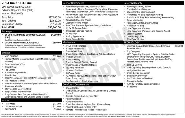 Sapphire Blue 2024 Kia K5 GT-Line FWD 8-Speed Automatic 1.6L I4 DGI Turbocharged DOHC 16V LEV3-ULEV70 180hp WE DELIVER ANYWHERE, Ford Blue Advantage Blue Certified Certified, Forward Collision Avoidance-Assist, Gloss Black Trim, GT-Line Panoramic Sunroof Package, GT-Line Premium Package, Highway Driving Assist, LED Interior Lighting, LED Projection Headlamps, Panoramic Sunroof, Smart Cruise Control w/Stop & Go, 4-Wheel Disc Brakes, 6 Speakers, ABS brakes, Air Conditioning, Alloy wheels, AM/FM radio: SiriusXM, Apple CarPlay & Android Auto, Auto High-beam Headlights, Automatic temperature control, Brake assist, Bumpers: body-color, Cargo Net, Carpeted Floor Mats, Cloth/SynTex Seat Trim, Delay-off headlights, Driver door bin, Driver vanity mirror, Dual front impact airbags, Dual front side impact airbags, EC Mirror w/Homelink, Electronic Stability Control, Four wheel independent suspension, Front anti-roll bar, Front Bucket Seats, Front Center Armrest, Front dual zone A/C, Front fog lights, Front reading lights, Fully automatic headlights, Heated door mirrors, Heated Front Bucket Seats, Heated front seats, Illuminated entry, Knee airbag, Leather steering wheel, LED Trunk Light, Low tire pressure warning, Mud Guards, Navigation System, Occupant sensing airbag, Outside temperature display, Overhead airbag, Overhead console, Panic alarm, Passenger door bin, Passenger vanity mirror, Power door mirrors, Power driver seat, Power steering, Power windows, Radio data system, Radio: AM/FM/MP3 Audio System, Rear anti-roll bar, Rear seat center armrest, Rear side impact airbag, Rear window defroster, Remote keyless entry, Security system, Speed control, Speed-sensing steering, Split folding rear seat, Spoiler, Sport steering wheel, Steering wheel mounted audio controls, Tachometer, Telescoping steering wheel, Tilt steering wheel, Traction control, Trip computer, Turn signal indicator mirrors, Variably intermittent wipers, Wheels: 18 Gloss Black Machined Finish Alloy, Forward Collision Avoidance-Assist, Gloss Black Trim, GT-Line Panoramic Sunroof Package, GT-Line Premium Package, Highway Driving Assist, LED Interior Lighting, LED Projection Headlamps, Panoramic Sunroof, Smart Cruise Control w/Stop & Go.
