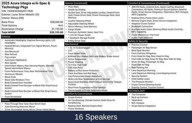 - Radio: ELS Studio 3D Premium Audio System -inc: 16 speakers, 9" touch-screen, SiriusXM, HD Radio, Bluetooth® streaming audio, 2.5-amp USB-A, 3-amp USB-C charge only, wireless Apple CarPlay and Android Auto compatibility, Bluetooth® HandsFreeLink wireless telephone interface, wi-fi hotspot capability, AcuraLink connected services and Alexa built-in
