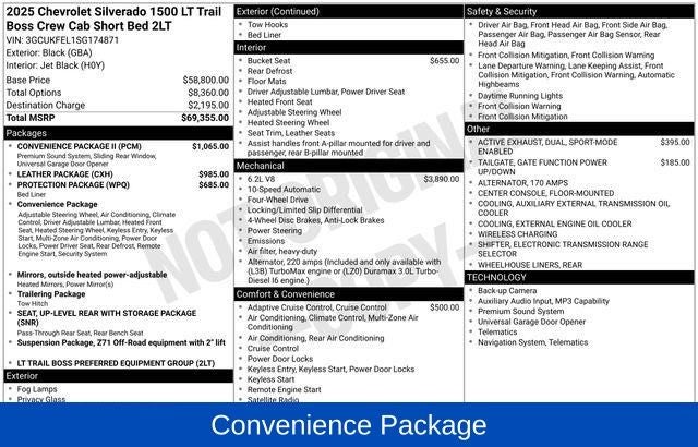 Black 2025 Chevrolet Silverado 1500 LT Trail Boss 4WD 8-Speed Automatic EcoTec3 6.2L V8 WE DELIVER ANYWHERE, 8-Speed Automatic, 4WD, Black Leather, 10-Way Power Driver Seat w/Lumbar, 12.3 Multicolor Reconfigurable Digital Display, 120-Volt Interior Power Outlet, 6-Speaker Audio System, All-Weather Floor Liner (LPO) (AAK), Auto-Locking Rear Differential, Bluetooth® For Phone, Chevytec Spray-On Black Bedliner, Color-Keyed Carpeting Floor Covering, Convenience Package, Convenience Package II, Deep-Tinted Glass, Dual Rear USB Ports (Charge Only), Dual-Zone Automatic Climate Control, Electric Rear-Window Defogger, Electronic Cruise Control, EZ Lift Power Lock & Release Tailgate, Front LED Fog Lamps, HD Rear Vision Camera, Heated Driver & Front Outboard Passenger Seats, Heated Power-Adjustable Outside Mirrors, Heated Steering Wheel, Heavy-Duty Air Filter, High Gloss Black Mirror Caps, Hill Descent Control, Hitch Guidance w/Hitch View, In-Vehicle Trailering System App, Inside Rear-View Mirror w/Tilt, Integrated Trailer Brake Controller, Keyless Open & Start, Leather Package, Leather-Appointed Front Seat Trim, LED Cargo Area Lighting, Manual Tilt/Telescoping Steering Column, OnStar Services Capable, Performance Red Recovery Hooks, Power Front Windows w/Driver Express Up/Down, Power Front Windows w/Passenger Express Down, Power Rear Windows w/Express Down, Power Sliding Rear Window w/Rear Defogger, Preferred Equipment Group 2LT, Premium Bose 7-Speaker Sound System, Protection Package, Rear 60/40 Folding Bench Seat (Folds Up), Rear Wheelhouse Liners, Remote Vehicle Starter System, SiriusXM w/360L Trial Subscription, Standard Tailgate, Steering Wheel Audio Controls, Suspension Package, Teen Driver, Theft Deterrent System (Unauthorized Entry), Tire Pressure Monitoring System, Trailering Package, Universal Home Remote, Up-Level Rear Seat w/Storage Package, Wrapped Steering Wheel, 120-Volt Bed Mounted Power Outlet, 170 Amp Alternator, 2 USB Data Ports, 220 Amp Alternator, 4-Wheel Disc Brakes, 40/20/40 Front Split-Bench Seat, 6 Speakers, ABS brakes, Adaptive Cruise Control, Air Conditioning, Alloy wheels, AM/FM radio: SiriusXM with 360L, Apple CarPlay/Android Auto, Auto High-beam Headlights, Automatic Emergency Braking, Automatic temperature control, Auxiliary External Transmission Oil Cooler, Brake assist, Cloth Seat Trim, Compass, Delay-off headlights, Driver door bin, Driver vanity mirror, Dual Active Exhaust, Dual front impact airbags, Dual front side impact airbags, Electronic Stability Control, Electronic Transmission Range Selector Shifter, Emergency communication system: OnStar, External Engine Oil Cooler, Floor Mounted Center Console, Following Distance Indicator, Forward Collision Alert, Front anti-roll bar, Front Bucket Seats, Front Center Armrest w/Storage, Front dual zone A/C, Front fog lights, Front Pedestrian Braking, Front reading lights, Front wheel independent suspension, Fully automatic headlights, Heated door mirrors, Heated front seats, Heated steering wheel, Hitch Guidance, Illuminated entry, IntelliBeam Automatic High Beam On/Off, Lane Keep Assist w/Lane Departure Warning, Low tire pressure warning, Occupant sensing airbag, Outside temperature display, Overhead airbag, Overhead console, Panic alarm, Passenger door bin, Passenger vanity mirror, Power door mirrors, Power driver seat, Power steering, Power Tailgate, Power windows, Premium audio system: Chevrolet Infotainment 3 Premium, Radio data system, Radio: Chevrolet Infotainment 3 Premium System, Rear reading lights, Rear step bumper, Rear window defroster, Remote keyless entry, Security system, Single Outlet Exhaust, Speed control, Speed-sensing steering, Split folding rear seat, Steering wheel mounted audio controls, Tachometer, Telescoping steering wheel, Tilt steering wheel, Traction control, Trip computer, Variably intermittent wipers, Voltmeter, Wheels: 20 x 9 High Gloss Black Painted