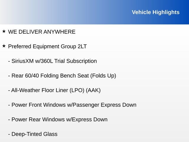 - Convenience Package includes (CJ2) dual-zone automatic climate control, (A2X) 10-way power driver seat including power lumbar, (KA1) heated driver and passenger seats, (N57) wrapped steering wheel, (KI3) heated steering wheel, (KI4) 120-volt power outlet, (KC9) 120-volt bed-mounted power outlet, (UBI) 2 charge-only USB ports for second row, (C49) rear-window defogger, (AVJ) Keyless Open and Start, (BTV) Remote Start, (UTJ) content theft alarm, (N37) Steering column, manual tilt and telescoping and (UF2) LED Cargo Area Lighting (Upgradeable to (A50) bucket seats and includes (D07) center console.)