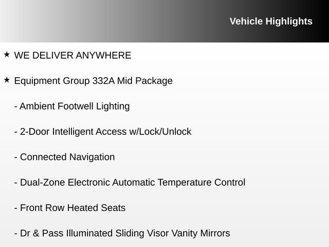 - SYNC 4 -inc: 12" LCD capacitive touchscreen w/swipe capability, wireless phone connection, cloud connected, 911 Assist, wireless Apple CarPlay and Android Auto compatibility, digital owner's manual and conversational voice command recognition