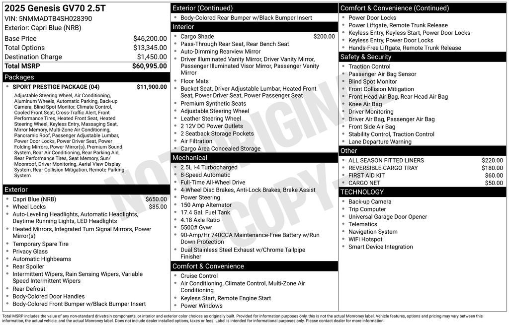 With its exceptional craftsmanship, impressive performance, and comprehensive suite of features, this 2025 Genesis GV70 2.5T Sport Prestige is a true testament to the brand's commitment to excellence. Experience the difference for yourself and schedule a test drive at our showroom today. We're confident this exceptional SUV will exceed your expectations and make your next automotive journey truly remarkable.